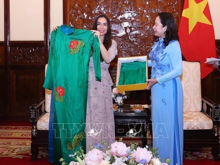 Phó Chủ tịch nước Võ Thị Ánh Xuân tặng áo dài Việt Nam cho bà Leyla Aliyeva, Phó Chủ tịch Quỹ Heydar Aliyev của Azerbaijan (Hà Nội, 22/4/2025). Ảnh: Văn Điệp - TTXVN
