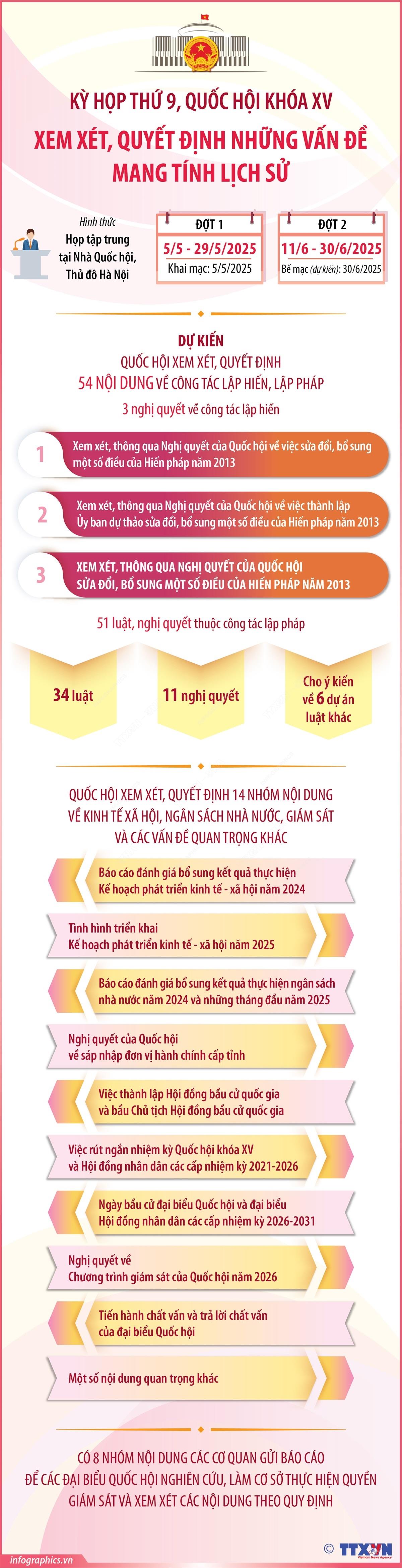 Tại Kỳ họp, Quốc hội sẽ xem xét, quyết định 54 nội dung về công tác lập hiến, lập pháp, gồm 3 nghị quyết về công tác lập hiến và 51 luật, nghị quyết thuộc công tác lập pháp; 14 nhóm nội dung về kinh tế xã hội, ngân sách Nhà nước, giám sát và các vấn đề quan trọng khác… trong đó có nội dung quan trọng mang tính lịch sử là dự kiến xem xét, thông qua Nghị quyết sửa đổi, bổ sung một số điều của Hiến pháp năm 2013 và Nghị quyết về sáp nhập đơn vị hành chính cấp tỉnh.