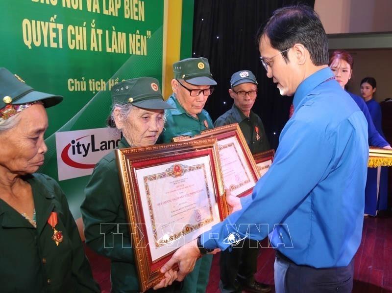 Đồng chí Bùi Quang Huy, Ủy viên dự khuyết Trung ương Đảng, Phó Chủ tịch Ủy ban Trung ương Mặt trận Tổ quốc Việt Nam, Bí thư Thứ nhất Ban Chấp hành Trung ương Đoàn trao tặng Huy chương Thanh niên xung phong vẻ vang cho cựu Thanh niên xung phong (15/7/2025). Ảnh: Minh Đức – TTXVN