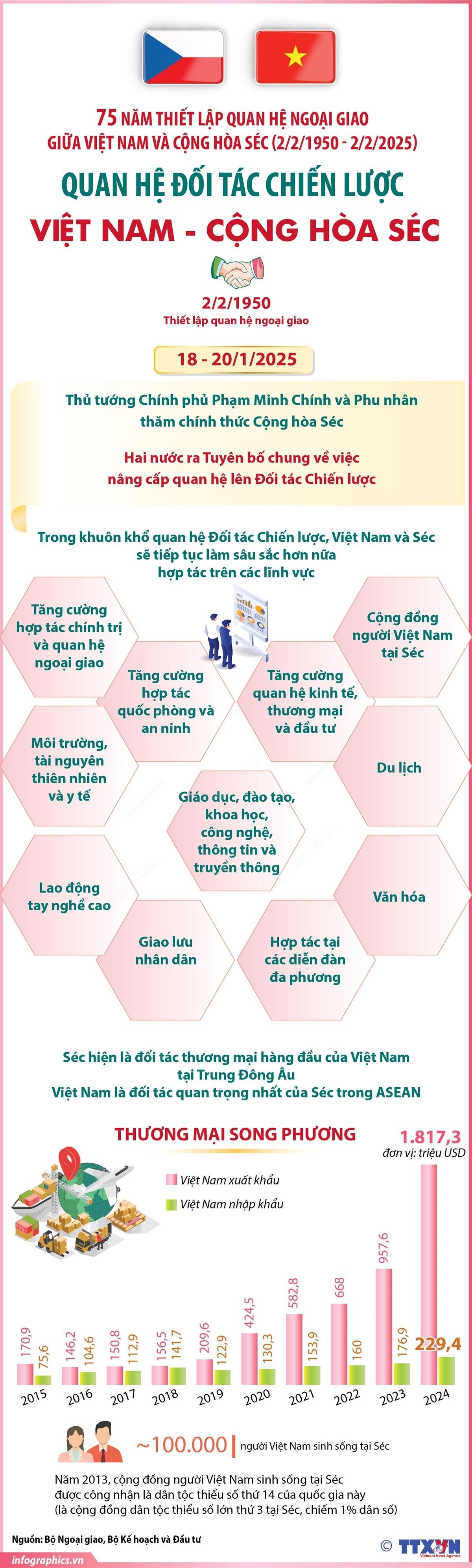 75 năm qua, mối quan hệ hữu nghị truyền thống và hợp tác nhiều mặt trước đây và quan hệ Đối tác chiến lược Việt Nam-Cộng hòa Séc ngày nay đã không ngừng được củng cố và phát triển, đạt được nhiều thành tựu tích cực.