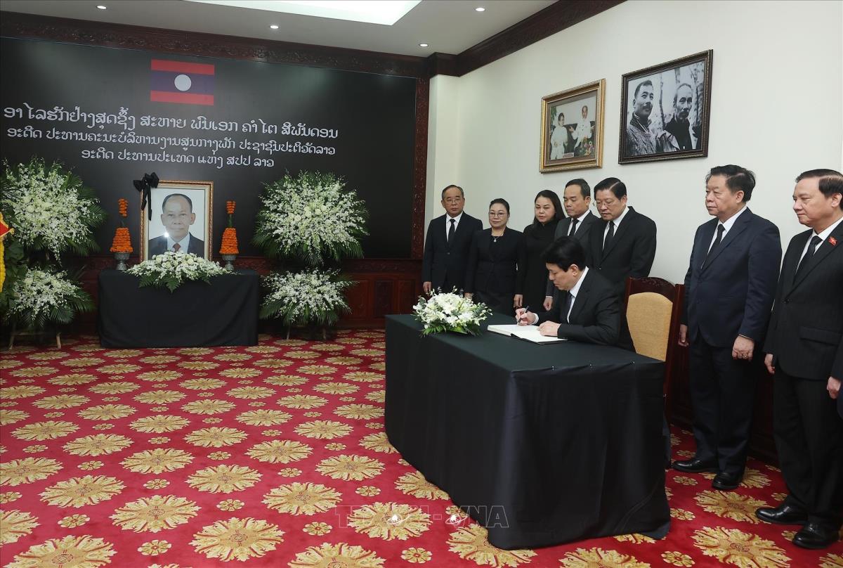 Hà Nội (TTXVN 4/4/2025) Sáng 4/4, Đoàn đại biểu cấp cao Đảng, Nhà nước Việt Nam do Chủ tịch nước Lương Cường dẫn đầu, Đoàn đại biểu cấp cao Chính phủ Việt Nam do Thủ tướng Chính phủ Phạm Minh Chính dẫn đầu và Đoàn đại biểu cấp cao Quốc hội Việt Nam do Phó Chủ tịch Quốc hội Nguyễn Khắc Định dẫn đầu đã viếng và ghi sổ tang tưởng niệm đồng chí Khamtay Siphandone, nguyên Chủ tịch Đảng Nhân dân Cách mạng Lào, nguyên Chủ tịch nước Lào.