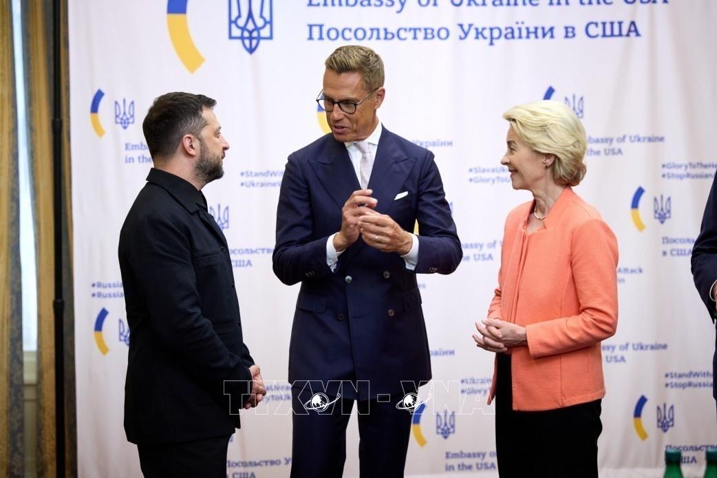 Tổng thống Ukraine Volodymyr Zelensky (thứ 3, phải) trong cuộc họp với Tổng thống Phần Lan Alexander Stubb, Thủ tướng Anh Keir Starmer, Thủ tướng Italy Giorgia Meloni, Chủ tịch Ủy ban Châu Âu Ursula von der Leyen và Tổng thư ký NATO Mark Rutte tại Washington, Mỹ ngày 18/8/2025. Ảnh: AA/TTXVN