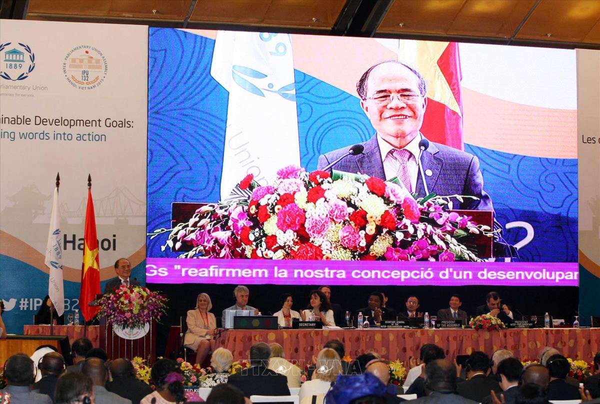 Chủ tịch Quốc hội Nguyễn Sinh Hùng phát biểu biểu tại Lễ bế mạc Đại hội đồng Liên minh Nghị viện Thế giới IPU-132, ngày 1/4/2015. Ảnh: TTXVN