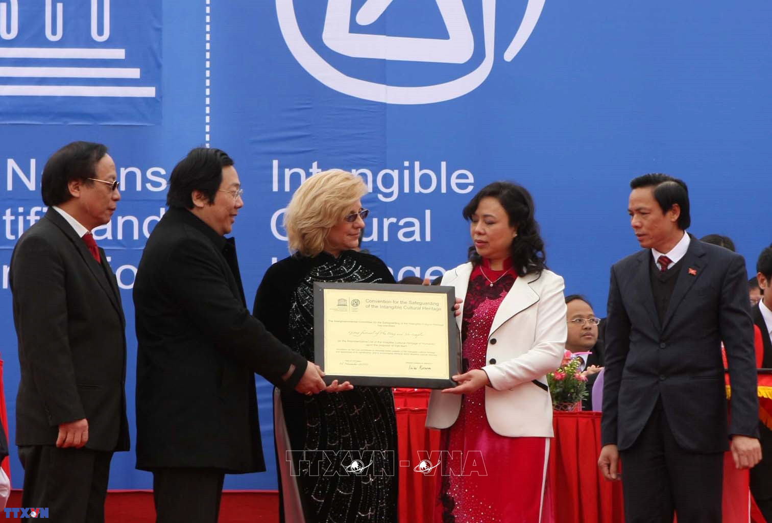 Bà Katherine Muller - Trưởng văn phòng UNESCO tại Hà Nội trao bằng Di sản phi vật thể của UNESCO cho Hội Gióng đền Phù Đổng và đền Sóc cho đại diện thành phố Hà Nội. Ảnh: Nhật Anh - TTXVN
