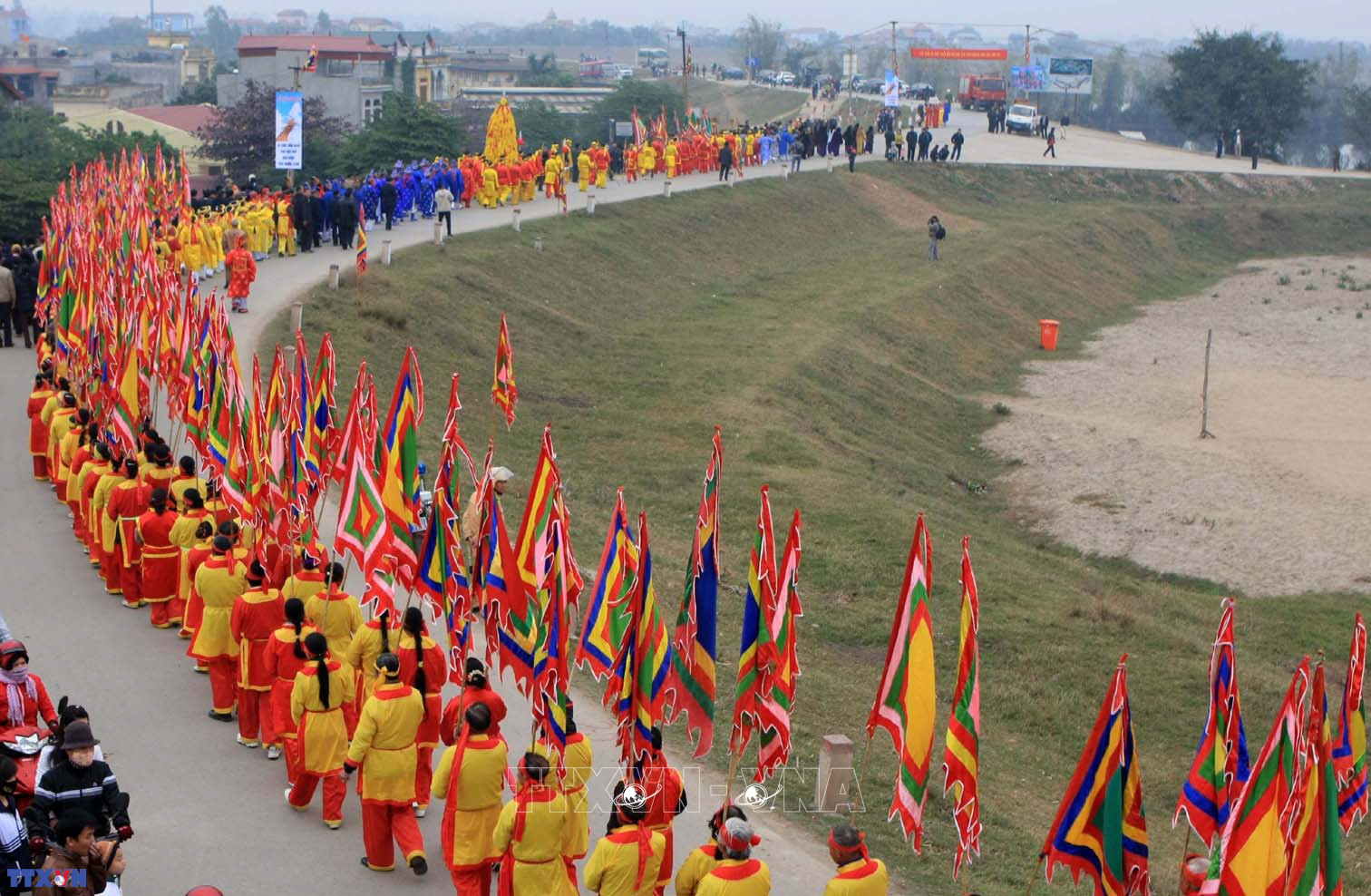 Đại diện bô lão trong làng rước bằng di sản về Đền Thánh Gióng. Ảnh: Nhật Anh - TTXVN