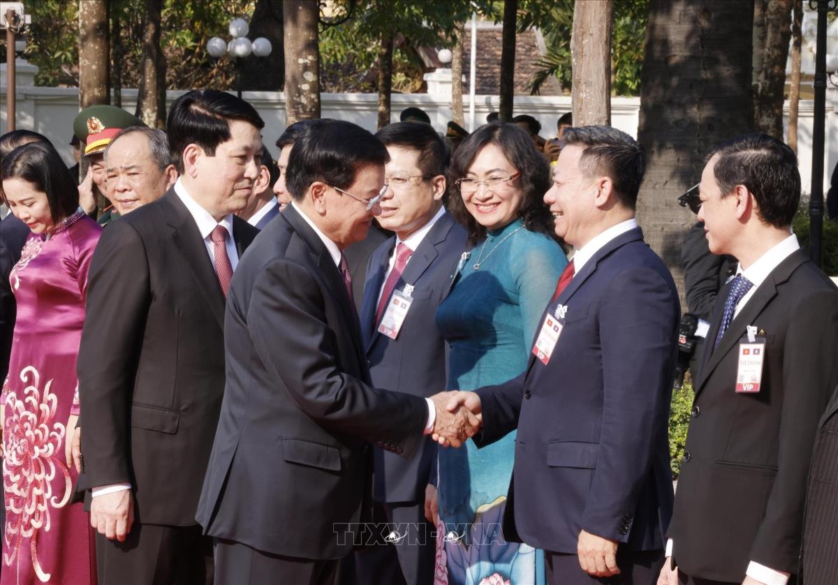 Chủ tịch nước Lương Cường với các thành viên Đoàn Lào tại lễ đón (24/4/2025. Ảnh: Lâm Khánh - TTXVN
