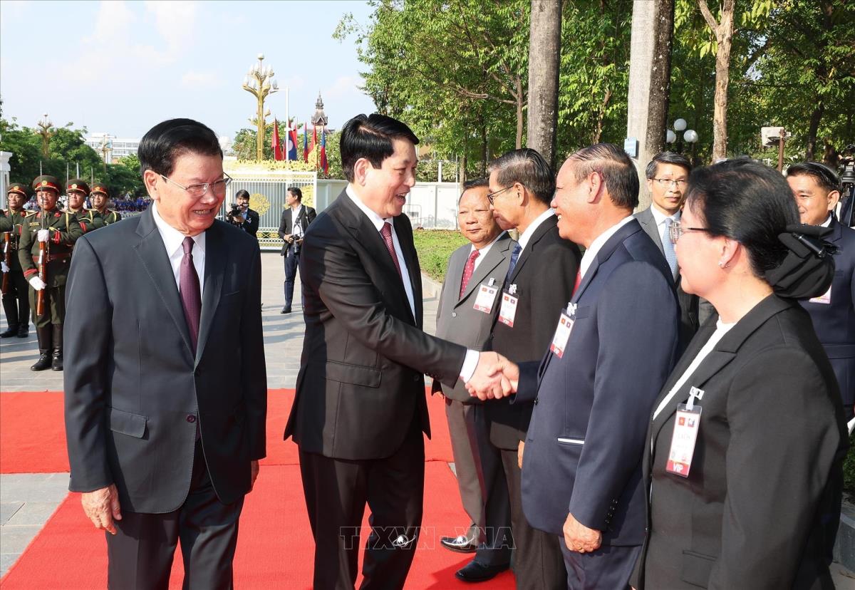 Tổng Bí thư, Chủ tịch nước Lào Thongloun Sisoulith đón Chủ tịch nước Lương Cường (24/4/2025). Ảnh: Lâm Khánh – TTXVN