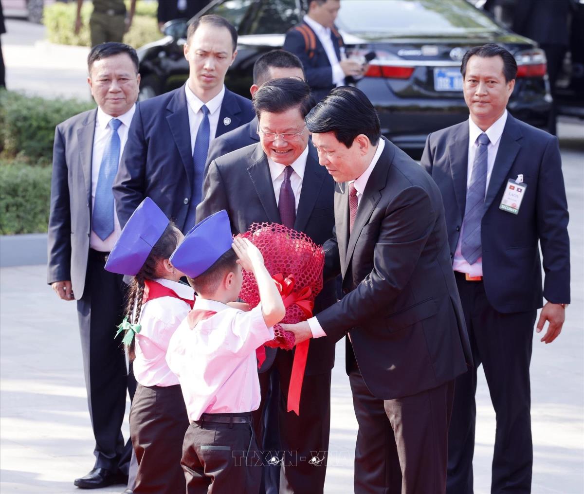Thiếu nhi Thủ đô Vientiane tặng hoa, chào mừng Chủ tịch nước Lương Cường thăm cấp Nhà nước tới CHDCND Lào (24/4/2025). Ảnh: Lâm Khánh – TTXVN