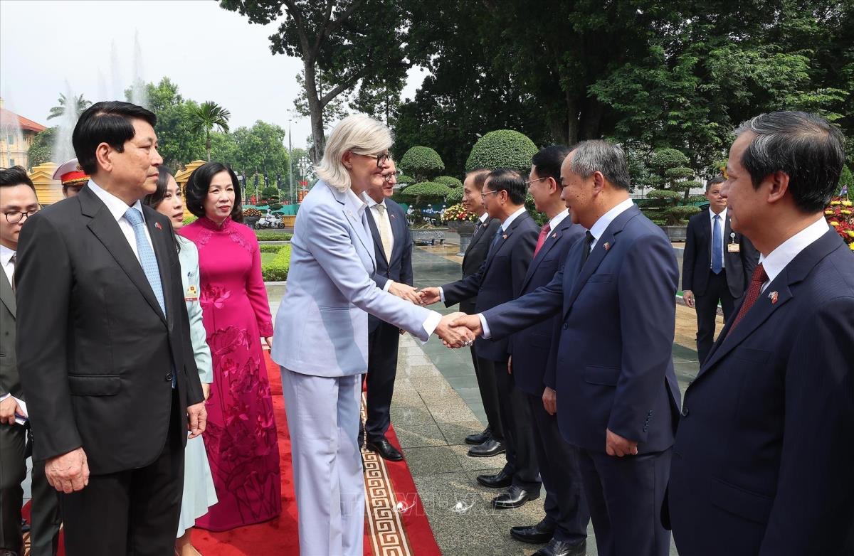 Chủ tịch nước Lương Cường giới thiệu thành viên đoàn Việt Nam với Toàn quyền Australia Sam Mostyn (10/9/2025). Ảnh: Lâm Khánh – TTXVN