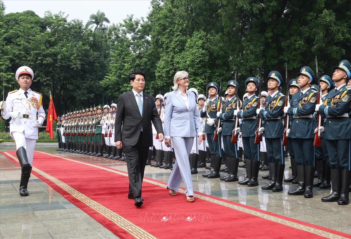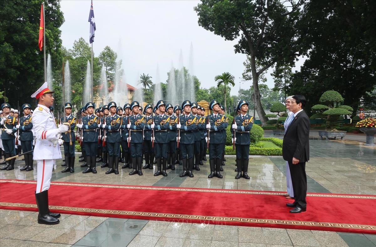 Chủ tịch nước Lương Cường và Toàn quyền Australia Sam Mostyn duyệt đội danh dự Quân đội nhân dân Việt Nam (10/9/2025). Ảnh: Lâm Khánh - TTXVN