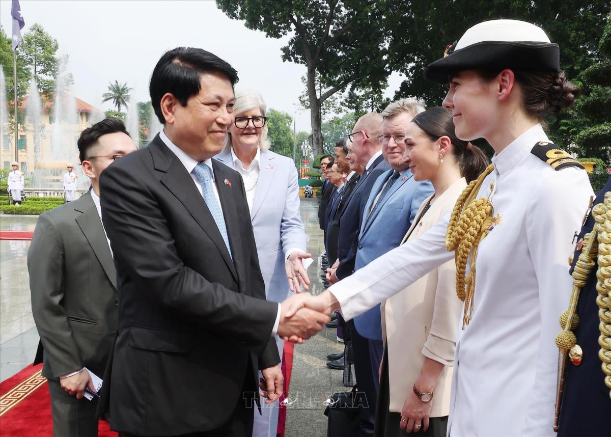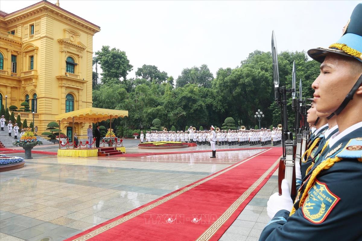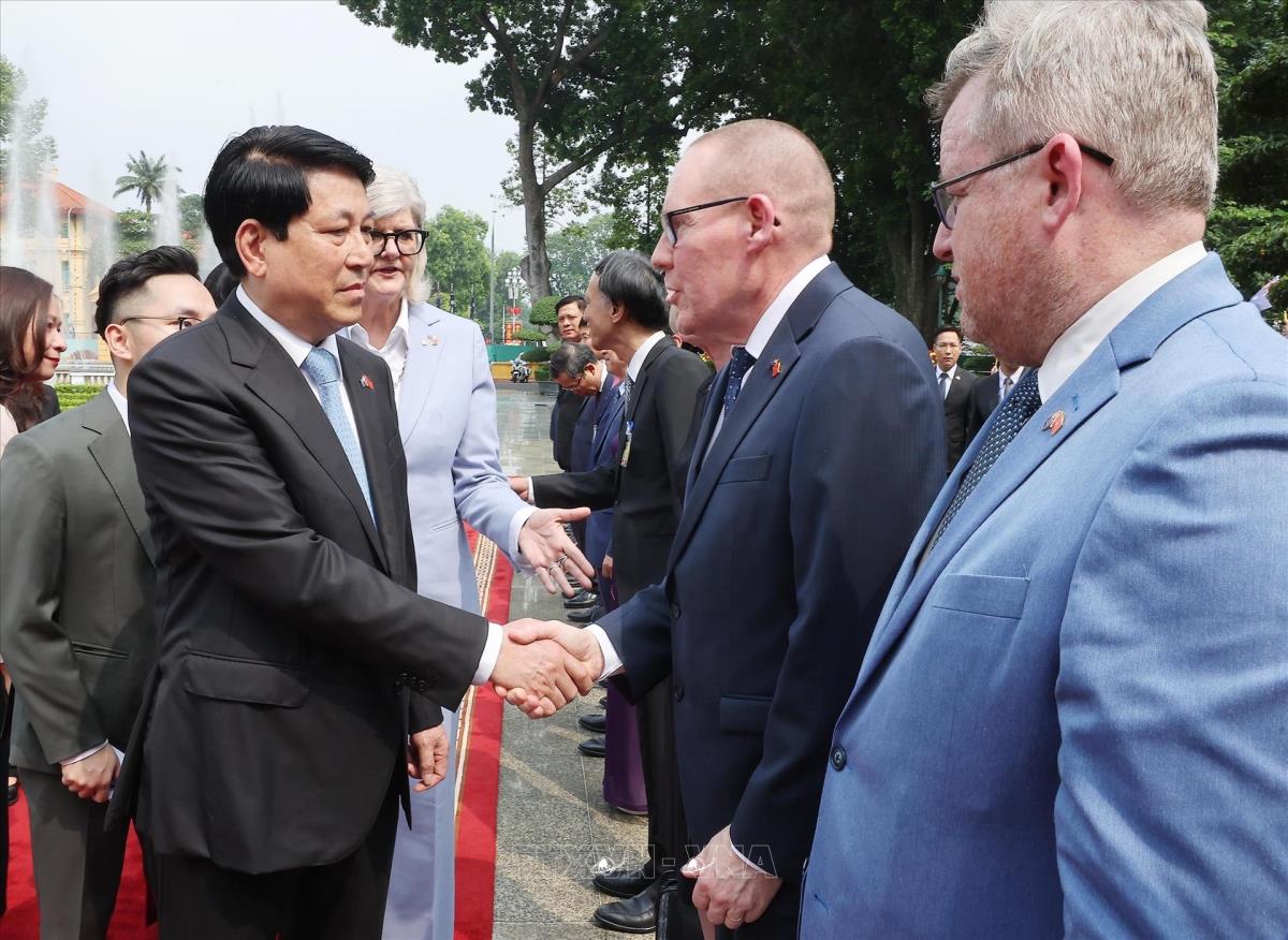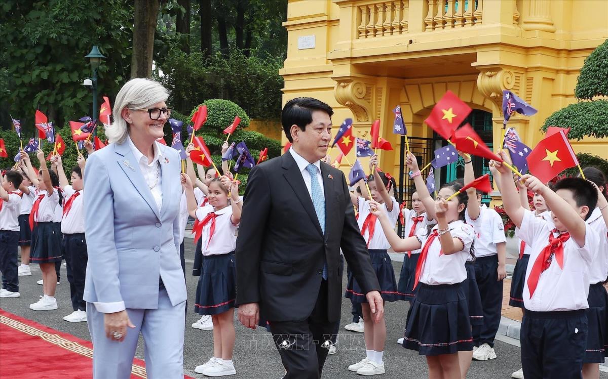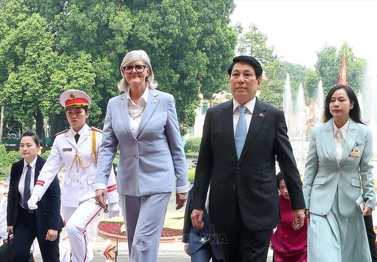 Hà Nội (TTXVN 10/9/2025) Chiều 10/9/2025, tại Phủ Chủ tịch, Chủ tịch nước Lương Cường và Phu nhân Nguyễn Thị Minh Nguyệt chủ trì Lễ đón chính thức Toàn quyền Australia Sam Mostyn và Phu quân Simeon Beckett thăm cấp Nhà nước tới Việt Nam.