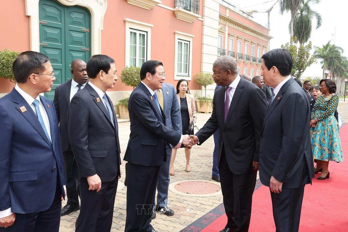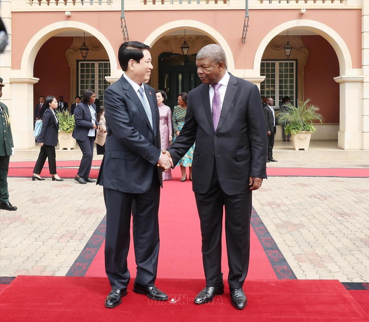 Tổng thống Angola João Manuel Gonçalves Lourenço đón Chủ tịch nước Lương Cường (7/8/225). Ảnh: Lâm Khánh - TTXVN