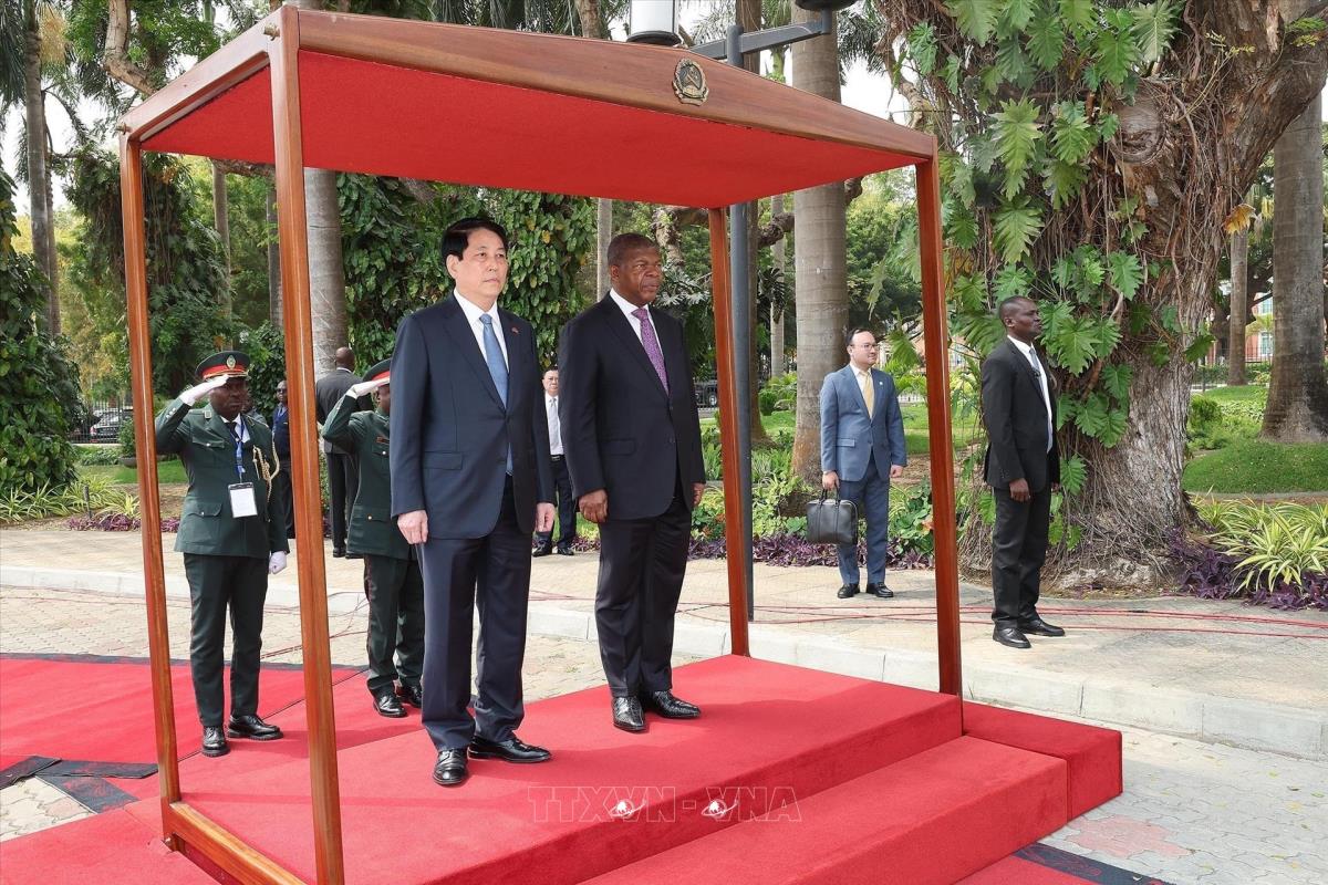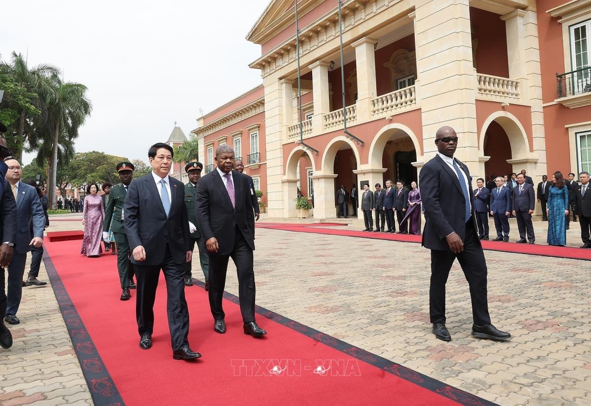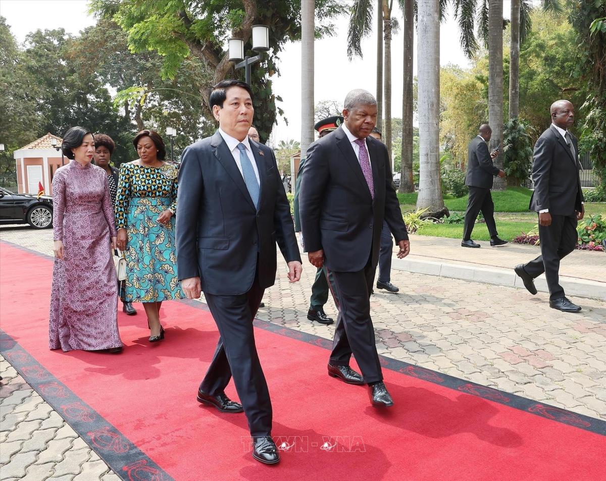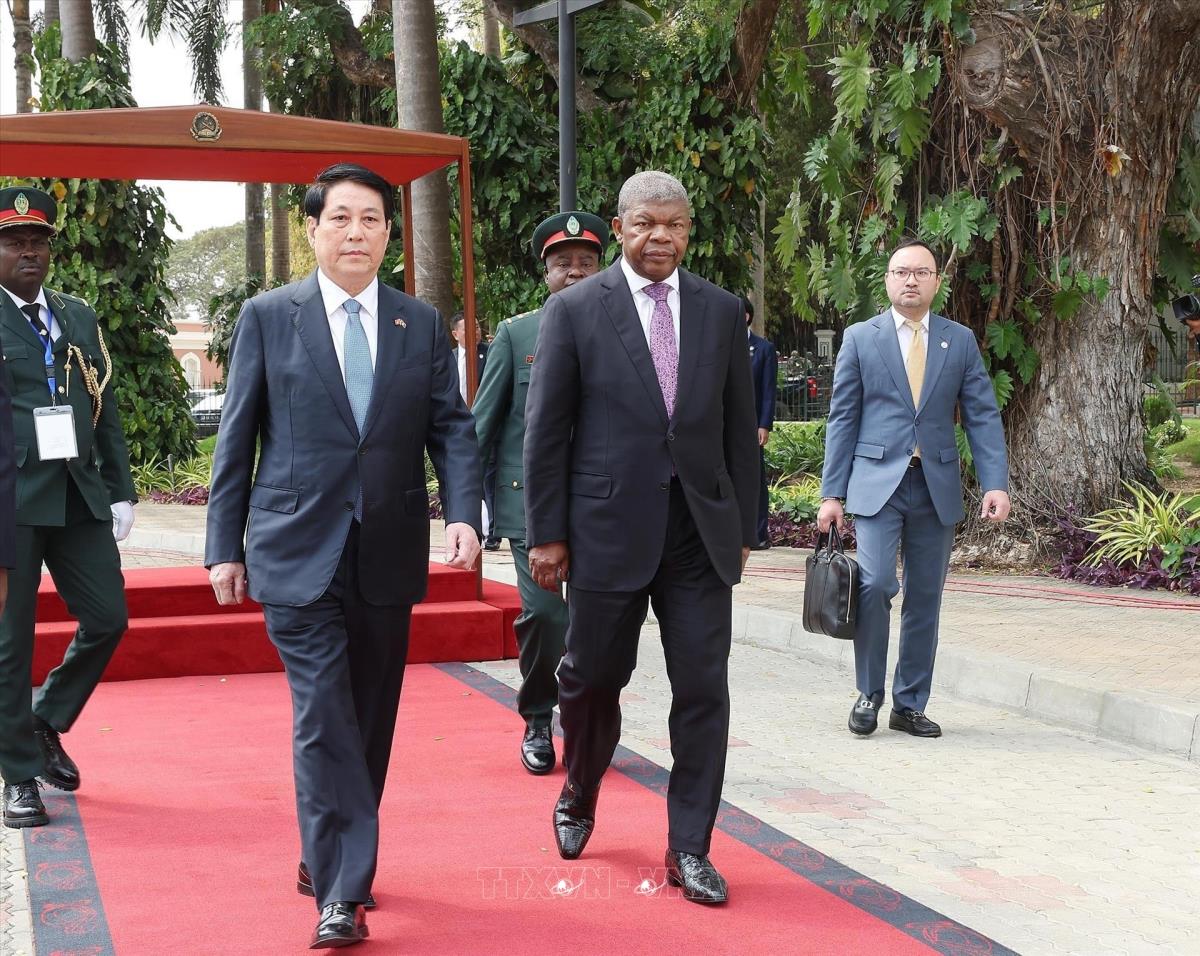 Hà Nội (TTXVN 7/8/2025) Trưa 7/8/2025, giờ địa phương (chiều tối cùng ngày, giờ Hà Nội), tại Phủ Tổng thống ở thủ đô Luanda, Tổng thống João Manuel Gonçalves Lourenço và Phu nhân chủ trì Lễ đón trọng thể Chủ tịch nước Lương Cường và Phu nhân cùng đoàn đại biểu cấp cao Việt Nam thăm cấp Nhà nước Cộng hoà Angola, theo nghi thức cao nhất dành cho Nguyên thủ quốc gia.
