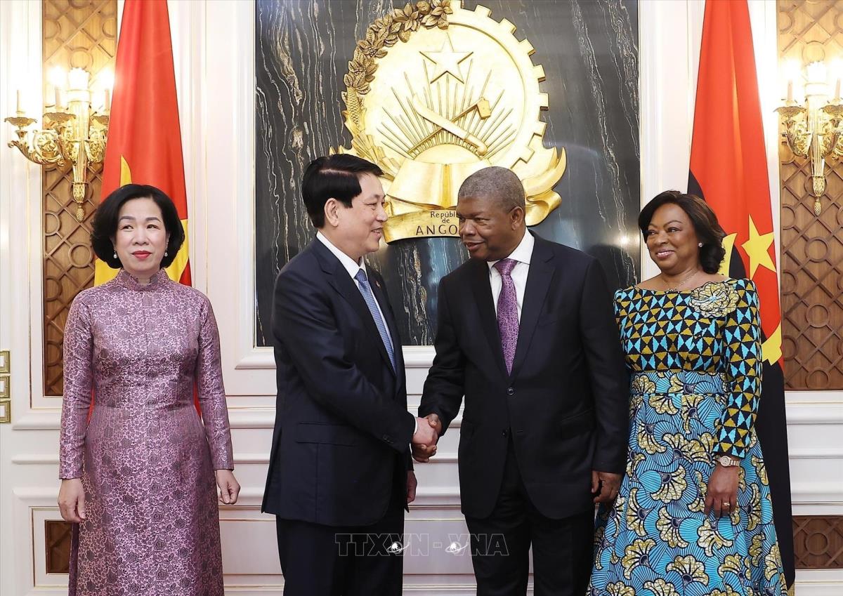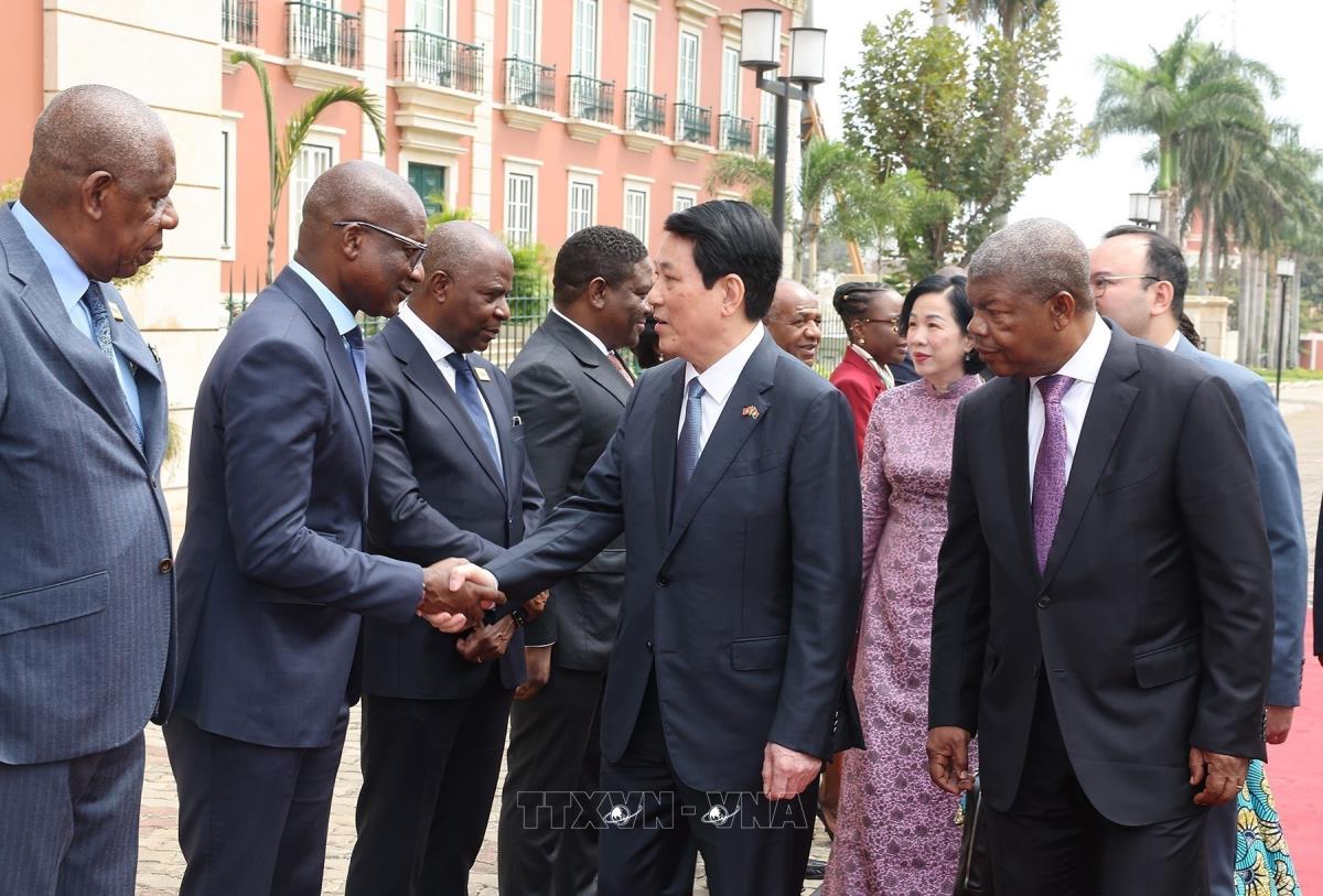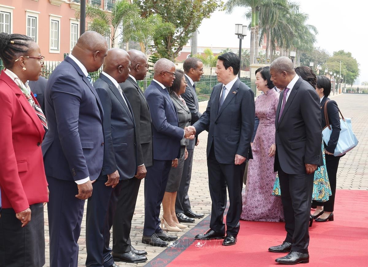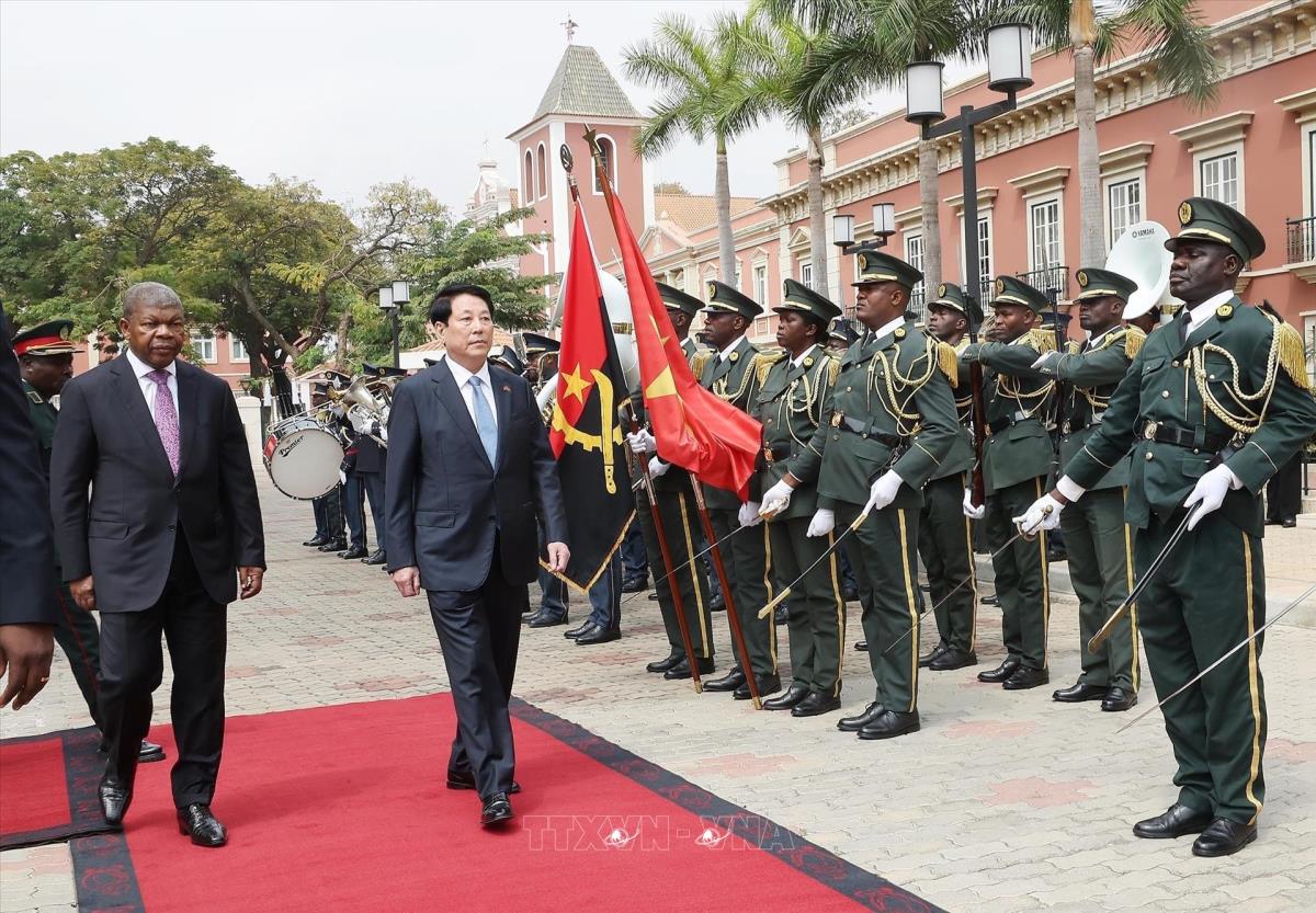Hà Nội (TTXVN 7/8/2025) Trưa 7/8/2025, giờ địa phương (chiều tối cùng ngày, giờ Hà Nội), tại Phủ Tổng thống ở thủ đô Luanda, Tổng thống João Manuel Gonçalves Lourenço và Phu nhân chủ trì Lễ đón trọng thể Chủ tịch nước Lương Cường và Phu nhân cùng đoàn đại biểu cấp cao Việt Nam thăm cấp Nhà nước Cộng hoà Angola, theo nghi thức cao nhất dành cho Nguyên thủ quốc gia.