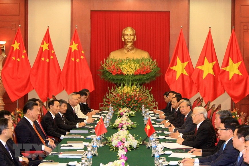 Tổng Bí thư Nguyễn Phú Trọng hội đàm với Tổng Bí thư, Chủ tịch nước Trung Quốc Tập Cận Bình. (Ảnh: Thống Nhất/TTXVN)