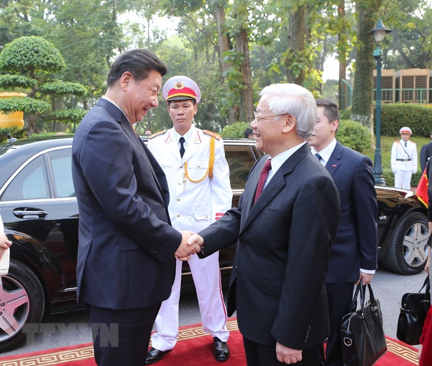 Tổng Bí thư Nguyễn Phú Trọng đón Tổng Bí thư, Chủ tịch nước Trung Quốc Tập Cận Bình. (Ảnh: Trí Dũng/TTXVN)