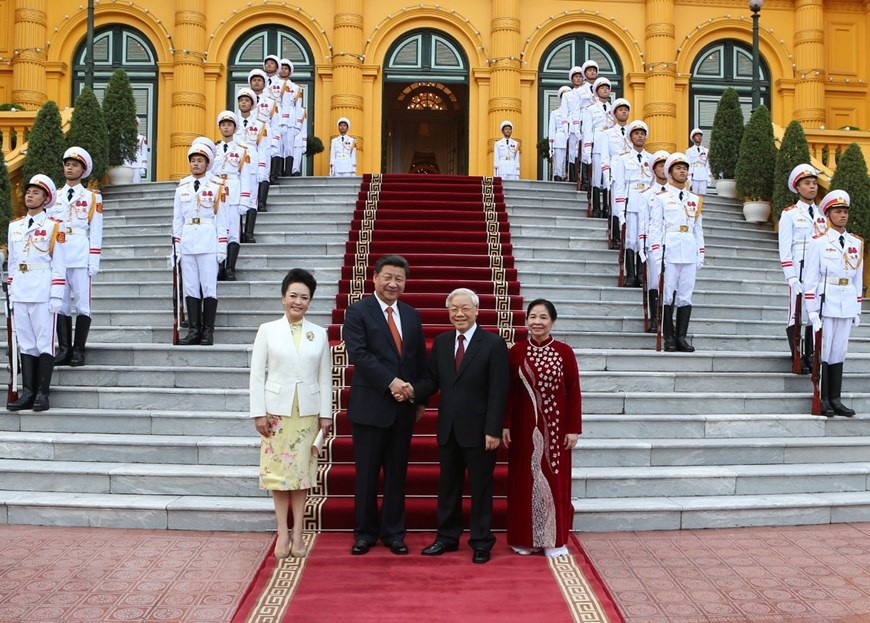 Tổng Bí thư Nguyễn Phú Trọng đón Tổng Bí thư, Chủ tịch nước Trung Quốc Tập Cận Bình tại Phủ Chủ tịch. (Ảnh: Trí Dũng/TTXVN)