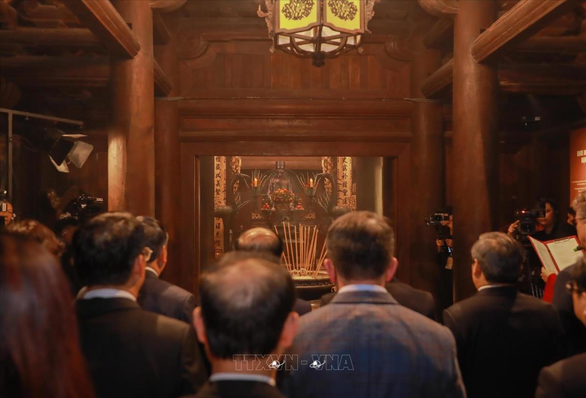 Các đại biểu thực hiện nghi lễ dâng hương ở đền thờ Chu Văn An tại Văn Miếu - Quốc Tử Giám, nơi là biểu tượng trường tồn của nền đạo học và trí tuệ Việt Nam (29/1/2026). Ảnh: Phan Phương – TTXVN