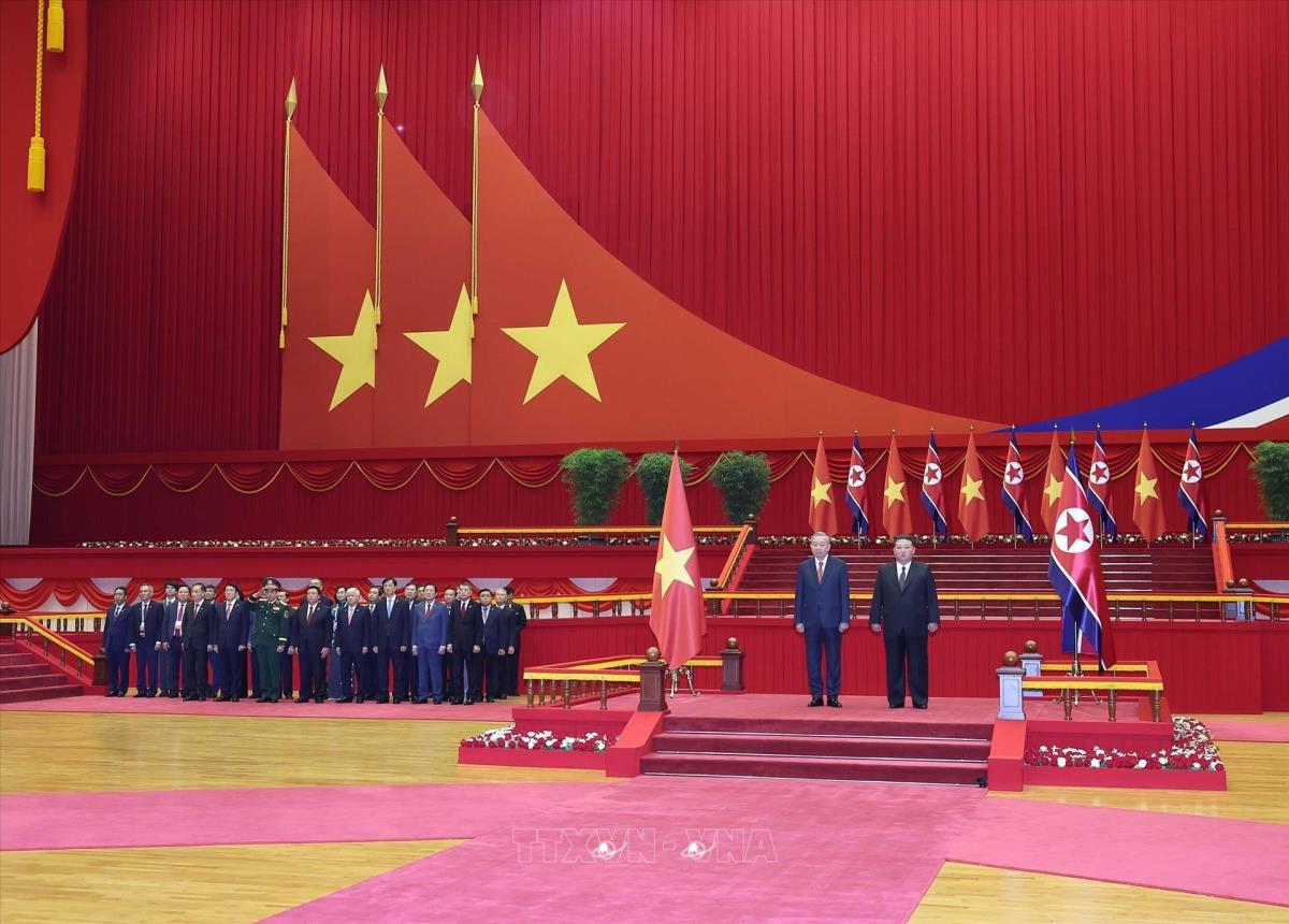 Tổng Bí thư Đảng Lao động Triều Tiên, Chủ tịch Quốc vụ nước Cộng hòa Dân chủ Nhân dân Triều Tiên Kim Jong Un đón và chào mừng Tổng Bí thư Tô Lâm thăm cấp Nhà nước tới Triều Tiên. Hai nhà Lãnh đạo di chuyển đến hàng quan chức và giới thiệu quan chức hai nước, sau đó tiến lên bục danh dự. Đội quân nhạc cử quốc thiều hai nước, trên nền nhạc có bắn 21 loạt đại bác rền vang chào đón Tổng Bí thư Tô Lâm và Đoàn đại biểu cấp cao Việt Nam.