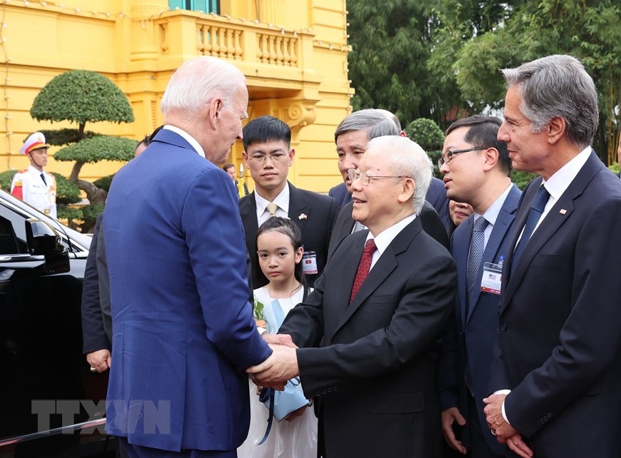 Tổng Bí thư Nguyễn Phú Trọng đón Tổng thống Hoa Kỳ Joe Biden. (Ảnh: Trí Dũng/TTXVN)
