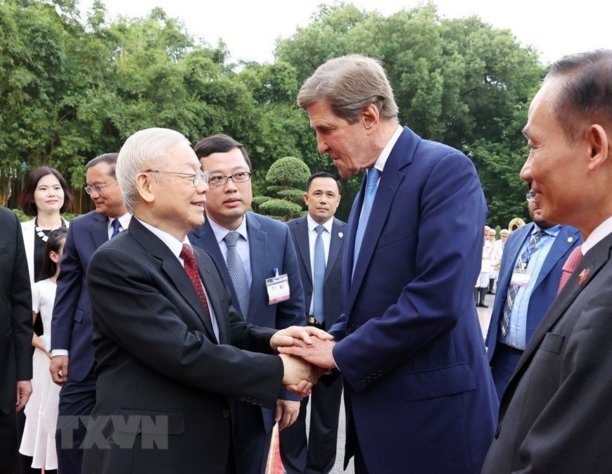 Tổng Bí thư Nguyễn Phú Trọng bắt tay ông John Kerry, Đặc phái viên về Khí hậu của Tổng thống Hoa Kỳ. (Ảnh: Trí Dũng/TTXVN)