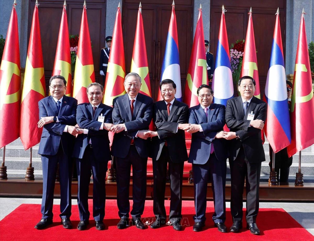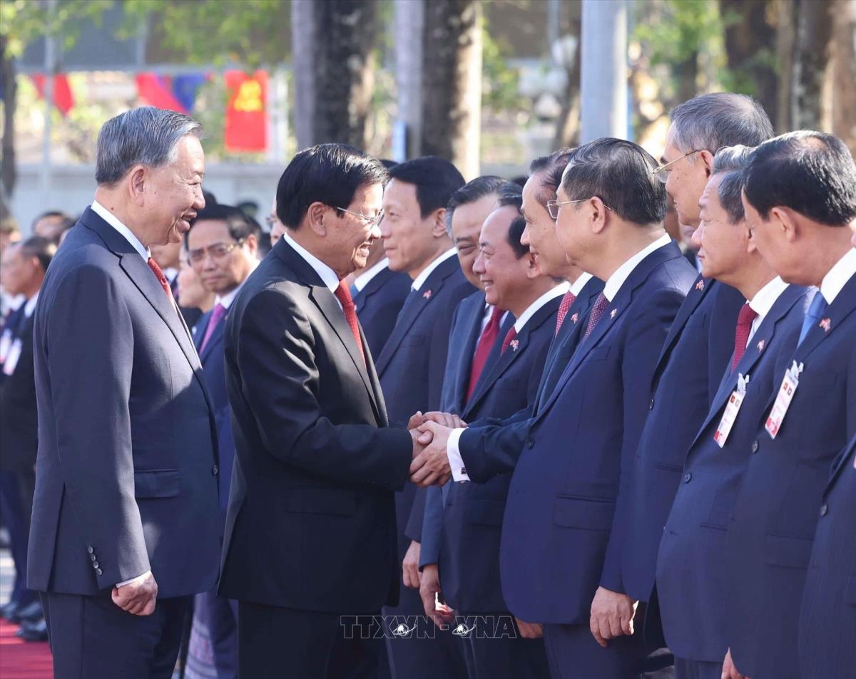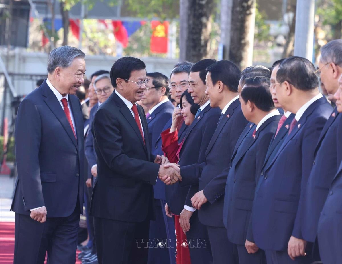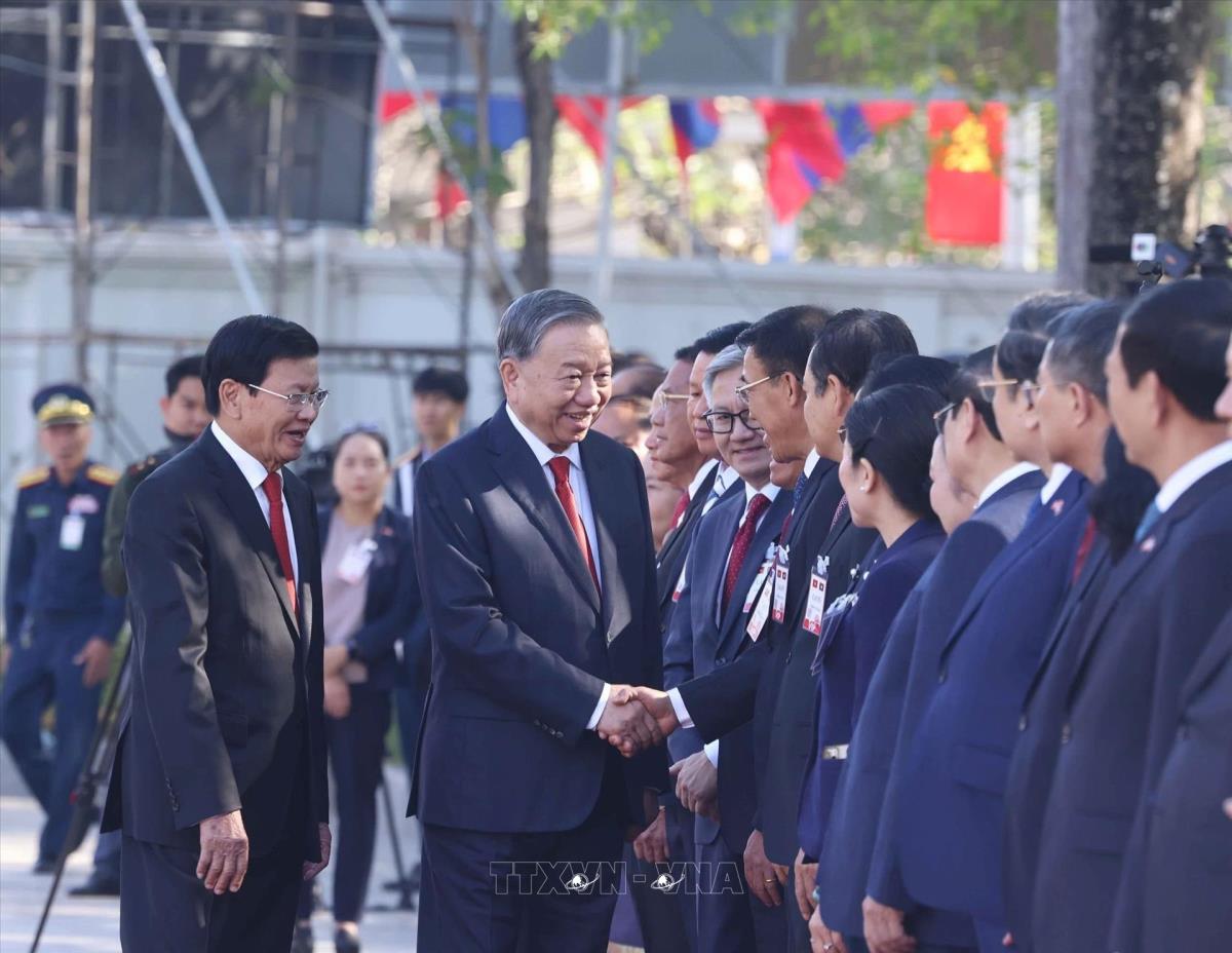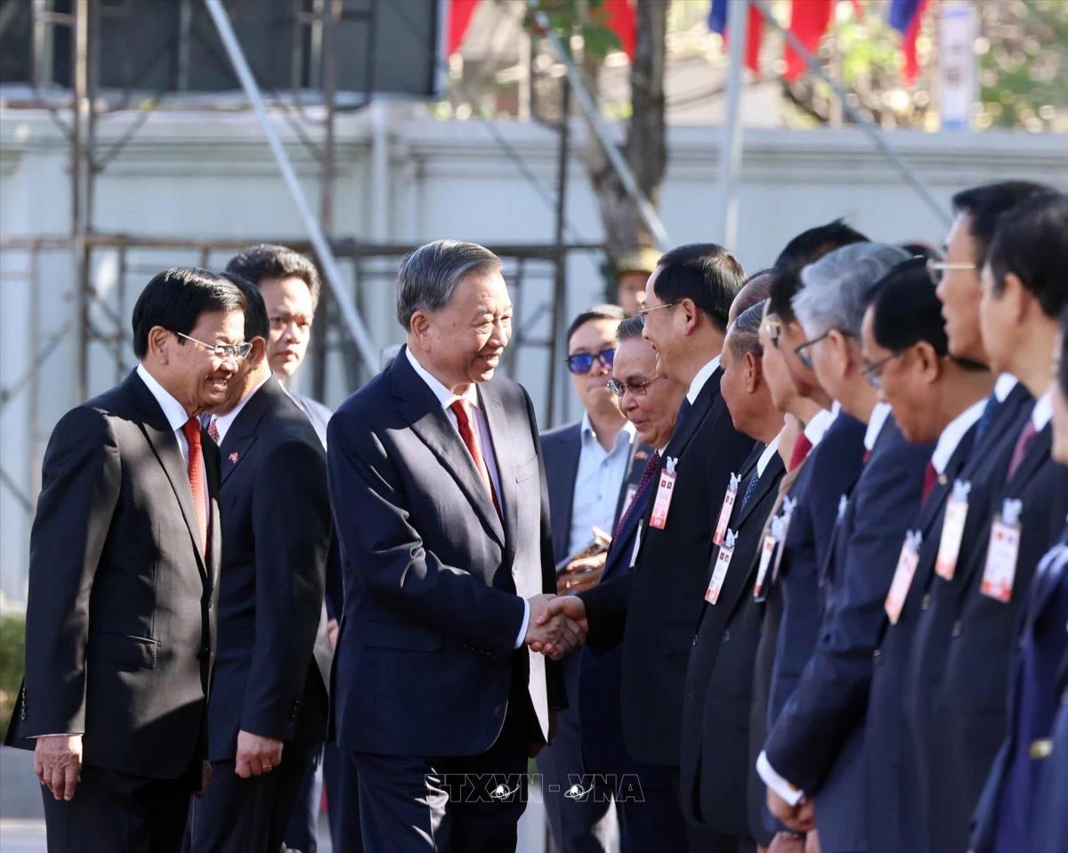 Tổng Bí thư Tô Lâm và Tổng Bí thư, Chủ tịch nước Lào Thongloun Sisoulith cùng các đồng chí Lãnh đạo chủ chốt hai nước (5/2/2026). Ảnh: Thống Nhất - TTXVN