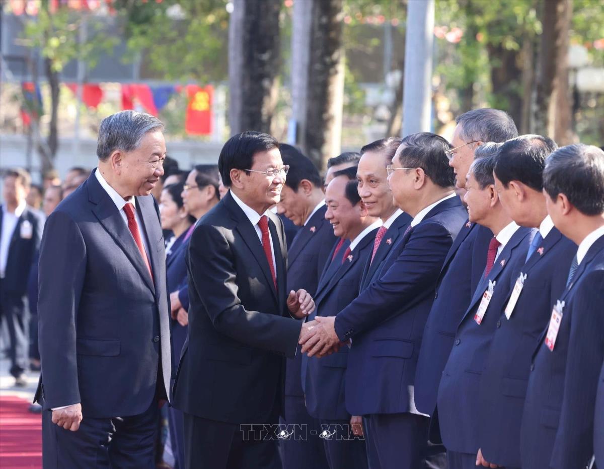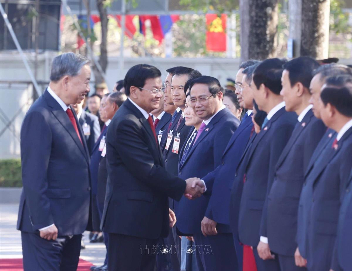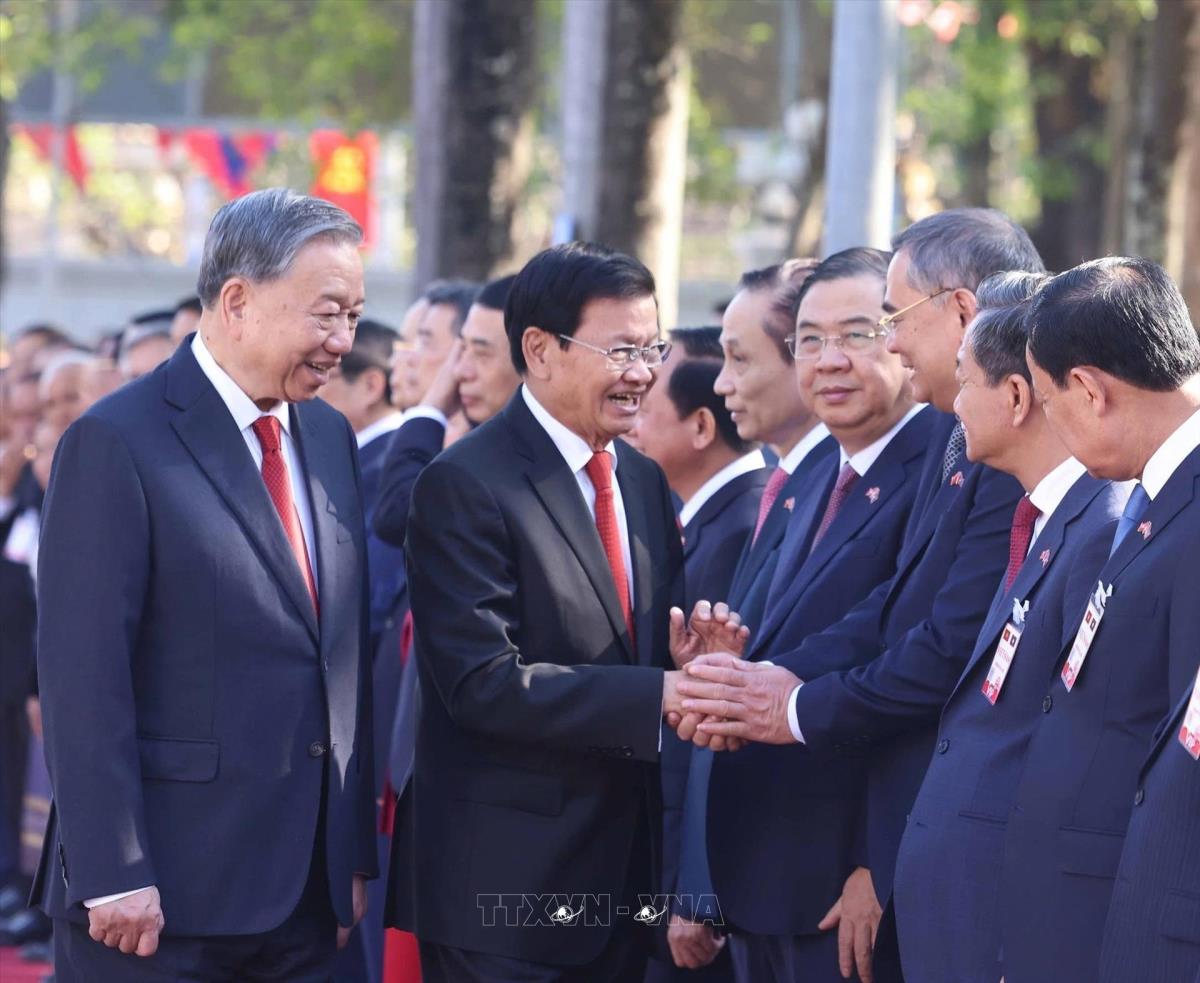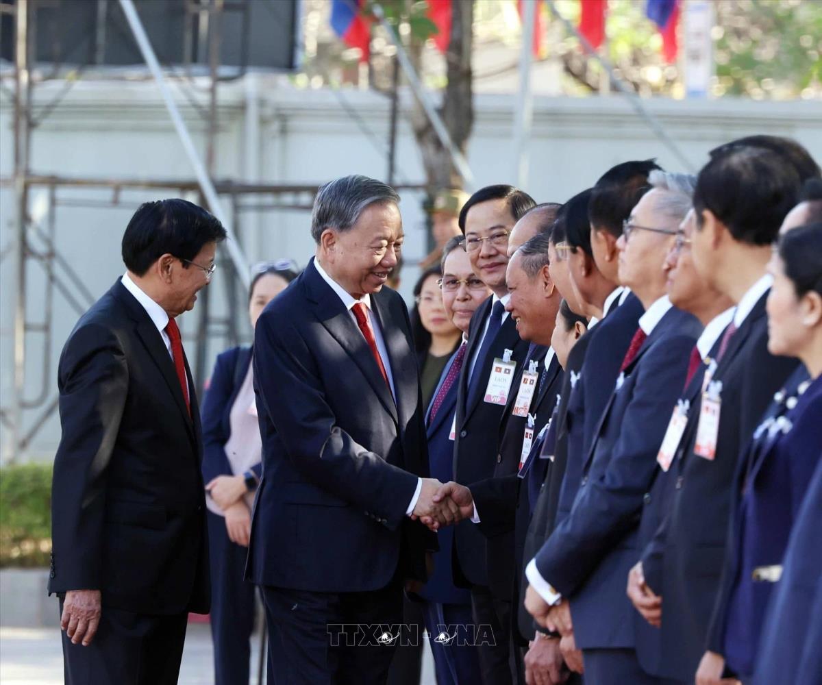 Tổng Bí thư Tô Lâm và Tổng Bí thư, Chủ tịch nước Lào Thongloun Sisoulith cùng các đồng chí Lãnh đạo chủ chốt hai nước (5/2/2026). Ảnh: Thống Nhất - TTXVN