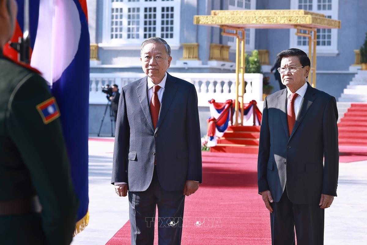 [Photo] Lễ đón trọng thể Tổng Bí thư Tô Lâm thăm cấp Nhà nước tới CHDCND Lào