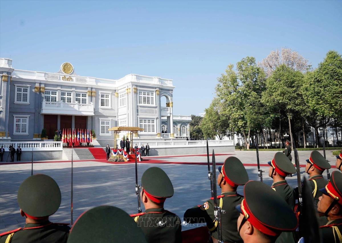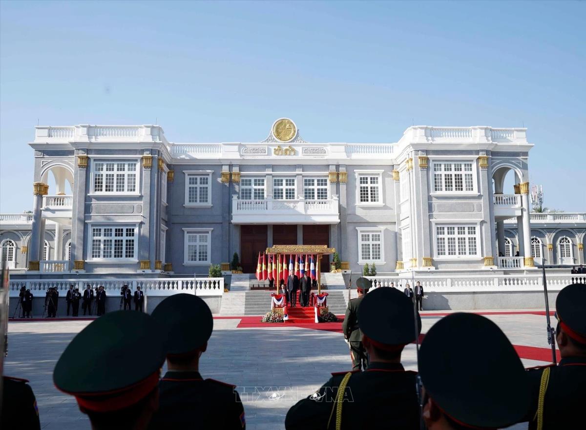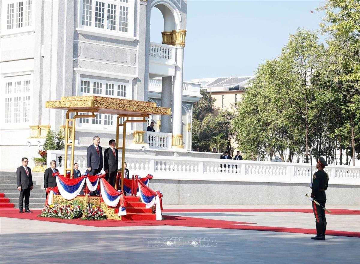 Tổng Bí thư, Chủ tịch nước Lào Thongloun Sisoulith chủ trì Lễ đón Tổng Bí thư Tô Lâm (5/2/2026). Ảnh: Dương Giang - TTXVN
