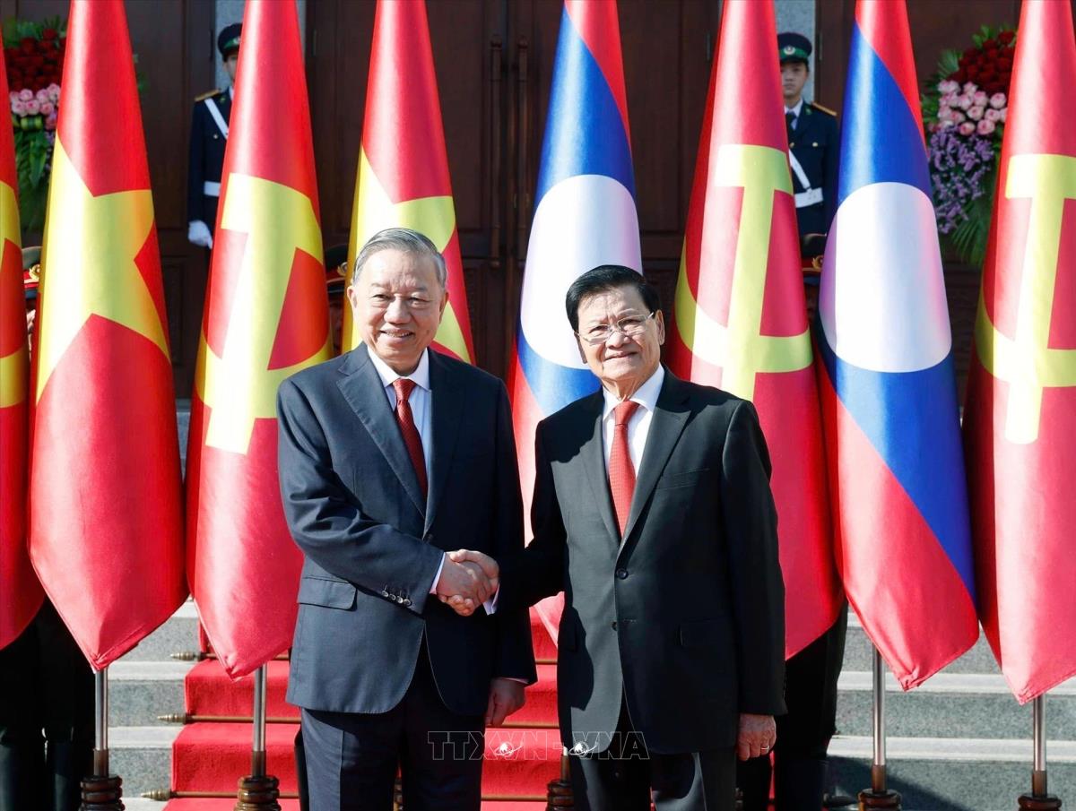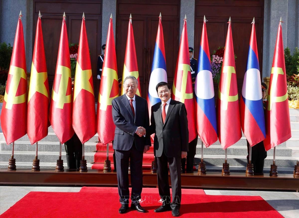 Tổng Bí thư, Chủ tịch nước Lào Thongloun Sisoulith đón Tổng Bí thư Tô Lâm (5/2/2026). Ảnh: Thống Nhất - TTXVN