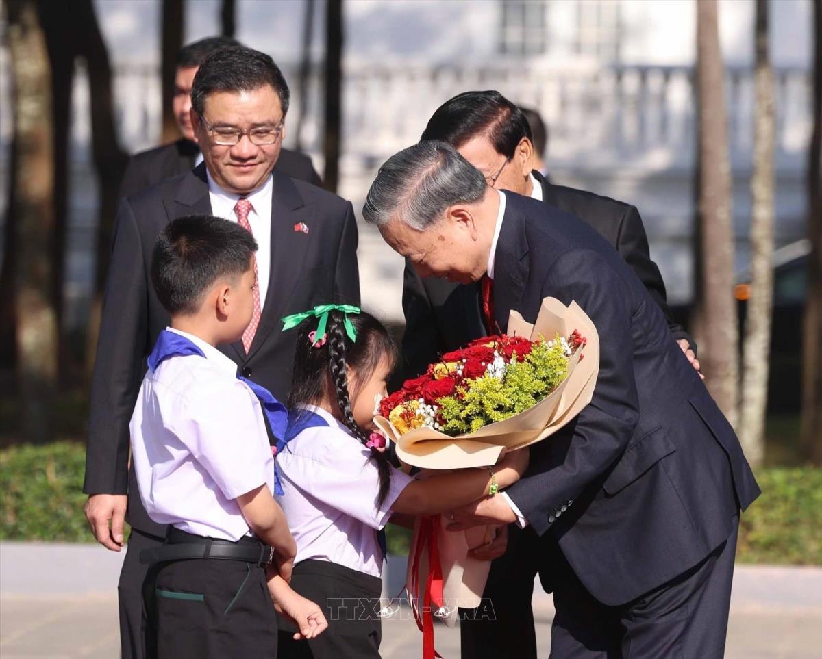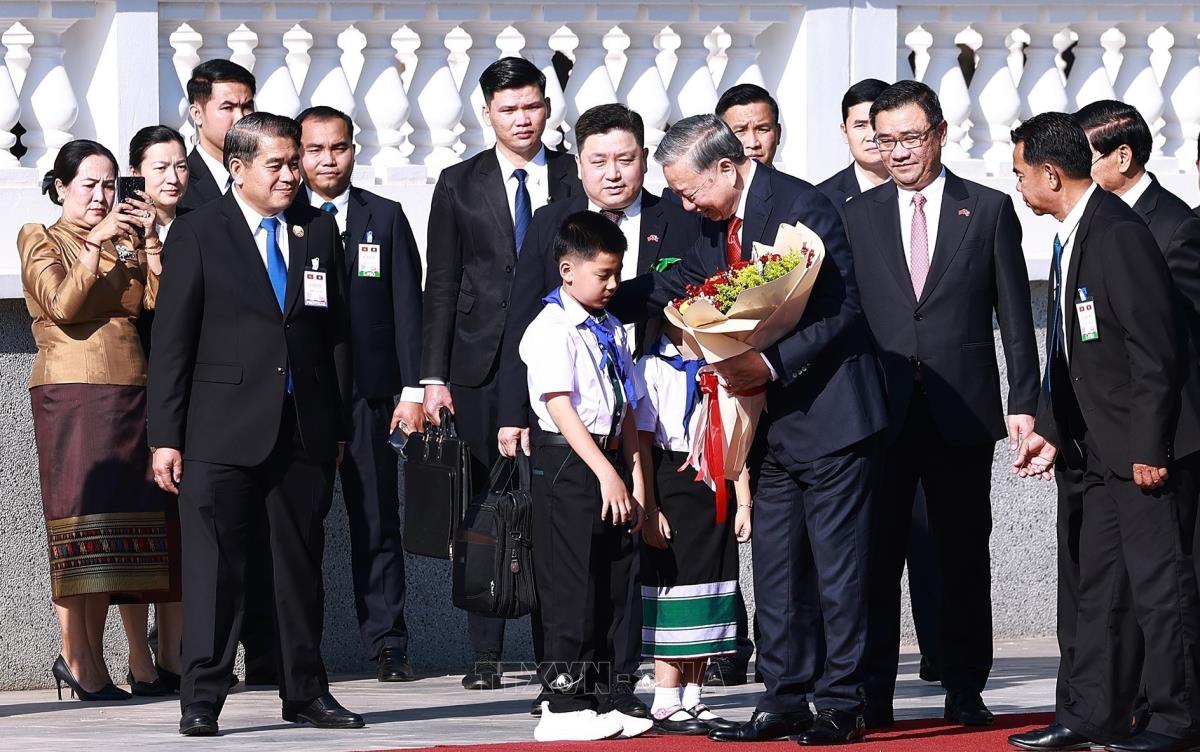 Thiếu nhi Lào tặng hoa, chào mừng Tổng Bí thư Tô Lâm thăm cấp Nhà nước tới CHDCND Lào (5/2/2026). Ảnh: Thống Nhất - TTXVN