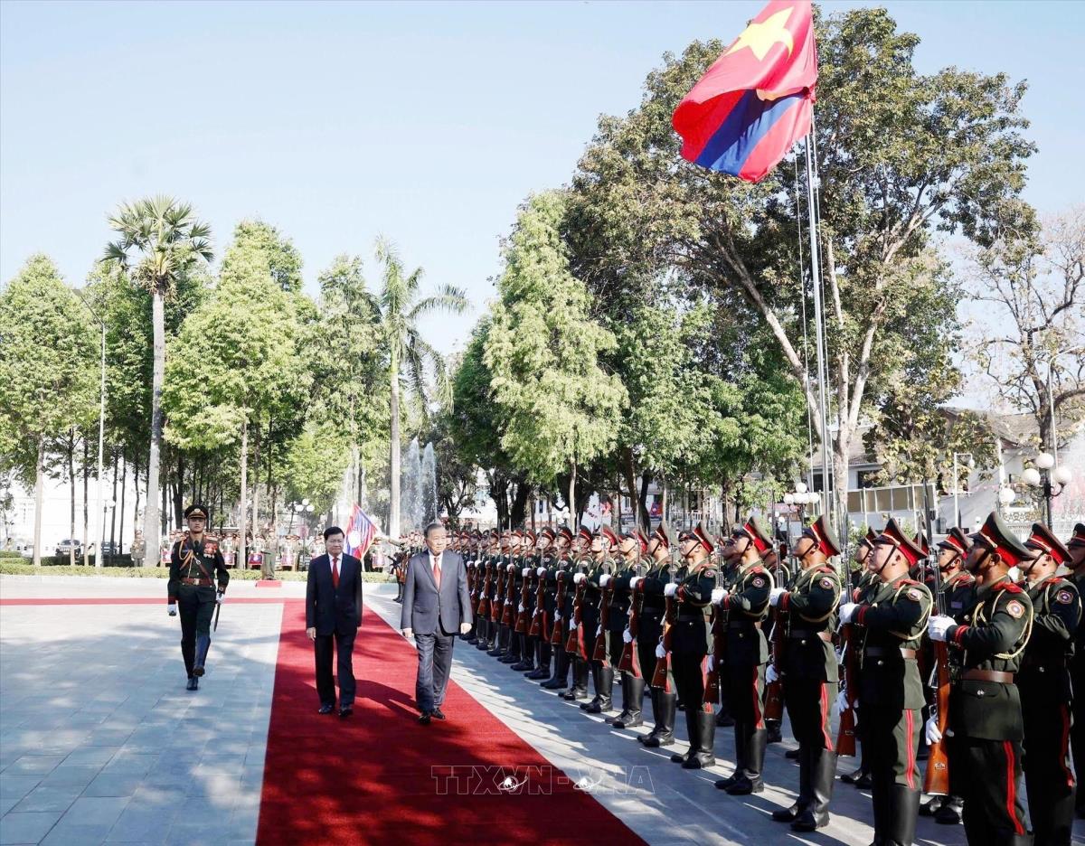 Tổng Bí thư Tô Lâm và Tổng Bí thư, Chủ tịch nước Lào Thongloun Sisoulith duyệt Đội danh dự Quân đội nhân dân Lào (5/2/2026). Ảnh: Thống Nhất - TTXVN