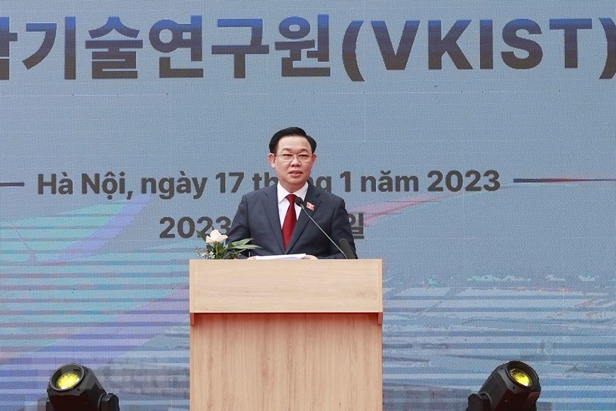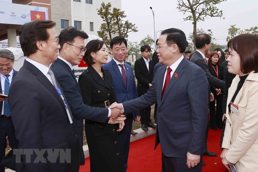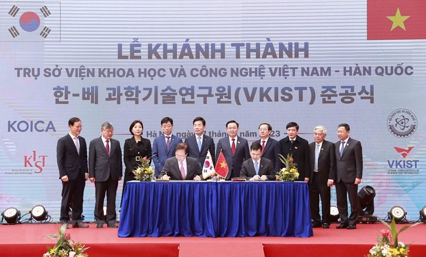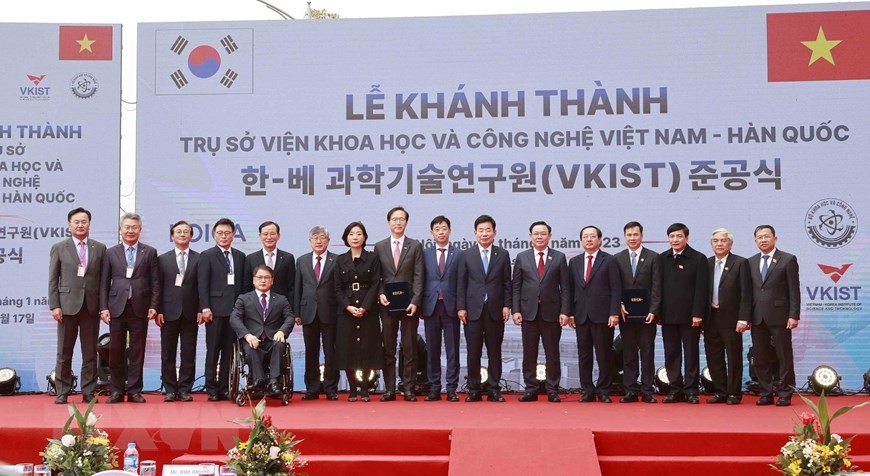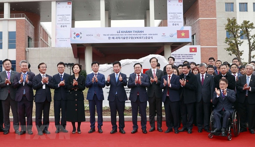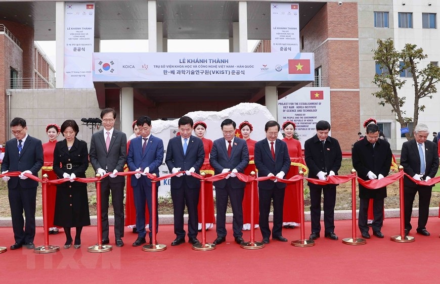 Hà Nội (TTXVN 17/1/2023) Sáng 17/1/2023, Chủ tịch Quốc hội Vương Đình Huệ và Chủ tịch Quốc hội Hàn Quốc Kim Jin-pyo dự lễ khánh thành trụ sở Viện Khoa học và Công nghệ Việt Nam-Hàn Quốc tại Khu Công nghệ Cao Hòa Lạc, Hà Nội.