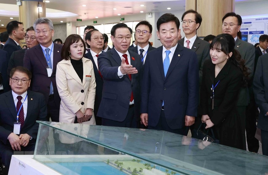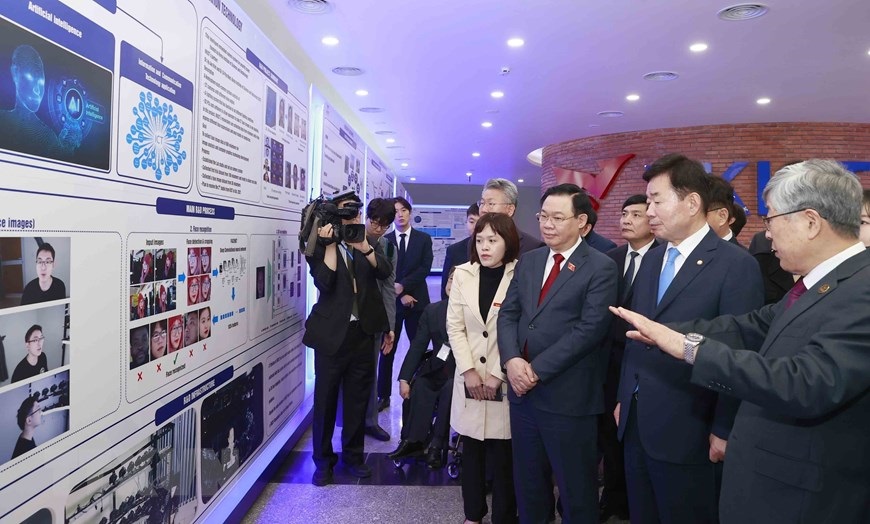 Hình ảnh Chủ tịch Quốc hội Vương Đình Huệ và Chủ tịch Quốc hội Hàn Quốc Kim Jin-pyo tham quan Viện Khoa học và Công nghệ Việt Nam-Hàn Quốc (VKIST). (Ảnh: Doãn Tấn/TTXVN)