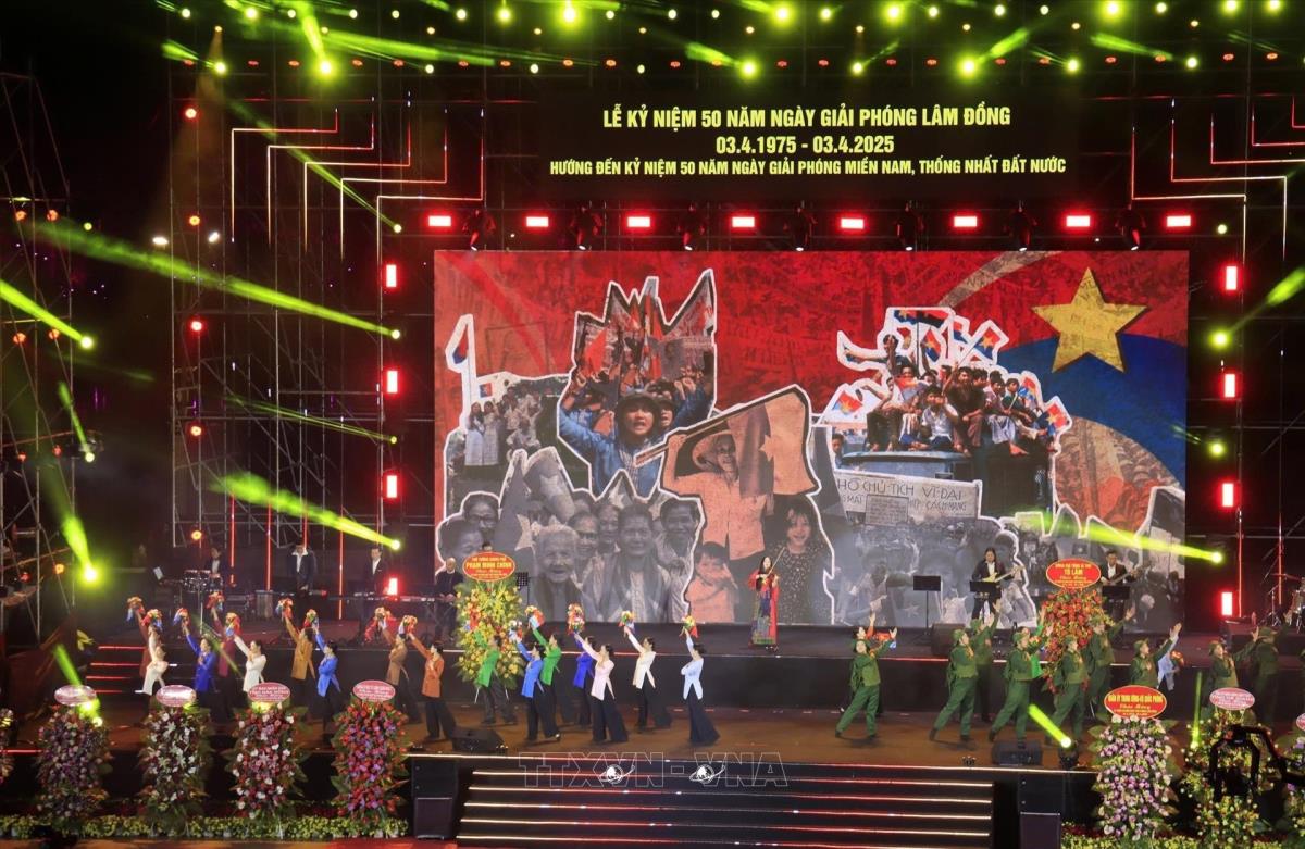 Sau phần lễ là chương trình nghệ thuật chào mừng kỷ niệm 50 năm Ngày giải phóng Lâm Đồng hướng đến kỷ niệm 50 năm Ngày thống nhất đất nước với chủ đề “Nam Tây Nguyên vui ngày giải phóng”. Chương trình như một “đại tiệc âm nhạc” kể về dòng chảy lịch sử của đất nước nói chung, Lâm Đồng nói riêng cho đến ngày non sông thống nhất. Những tác phẩm kinh điển của dòng nhạc cách mạng qua phần thể hiện của nhiều ca sỹ, nghệ sỹ nổi tiếng như Nghệ sĩ Ưu tú Việt Hoàng, Nghệ sĩ Ưu tú Đăng Dương, Diva Mỹ Linh, ca sỹ Khánh Linh, nhạc sỹ Y Phon Ksor… đã đem đến cho khán giả cảm giác thăng hoa trong ngày đất nước trọn niềm vui./.