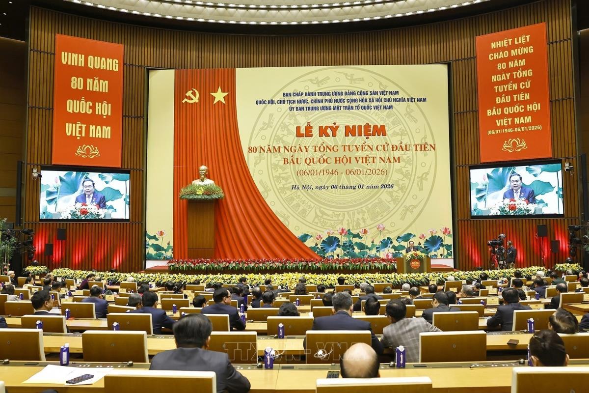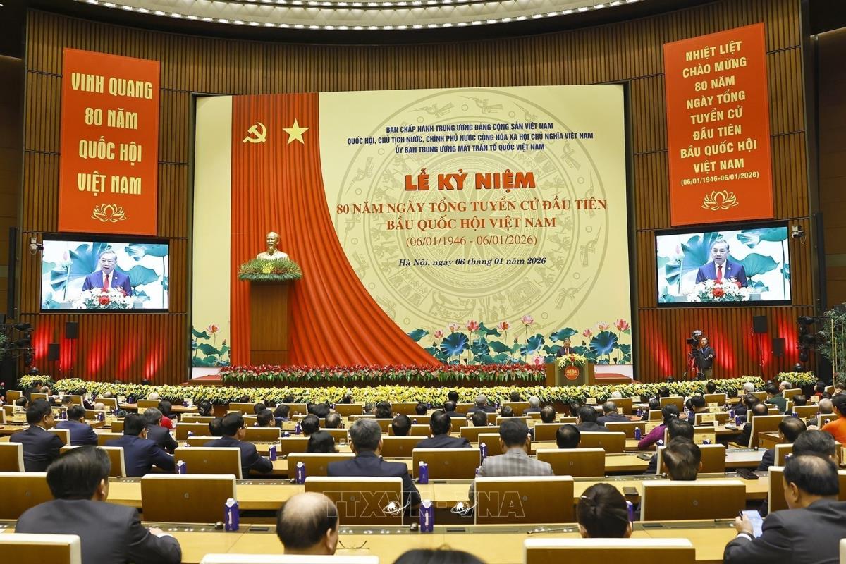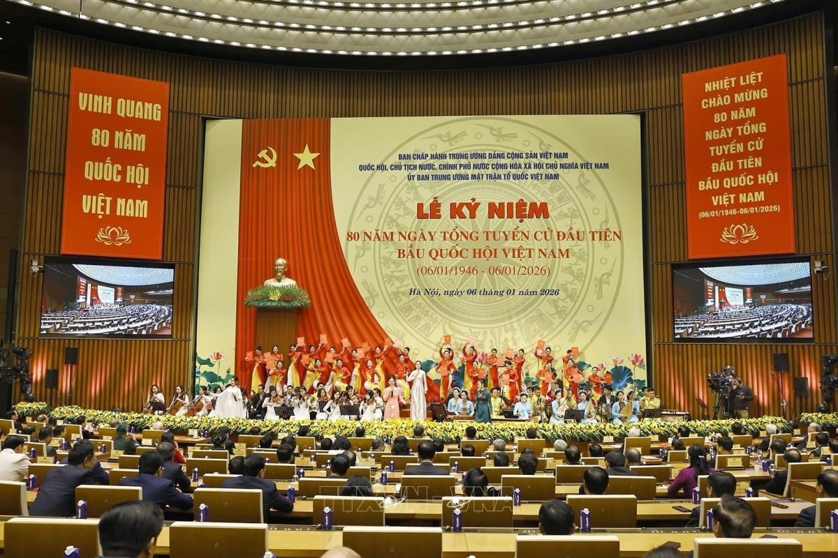 Hà Nội (TTXVN 6/1/2026) Sáng 6/1/2026, tại Hà Nội, Ban Chấp hành Trung ương Đảng, Quốc hội, Chủ tịch nước, Chính phủ nước Cộng hoà xã hội Chủ nghĩa Việt Nam, Ủy ban Trung ương Mặt trận Tổ quốc Việt Nam tổ chức Lễ kỷ niệm 80 năm Ngày Tổng tuyển cử đầu tiên bầu Quốc hội Việt Nam (6/1/1946 - 6/1/2026).