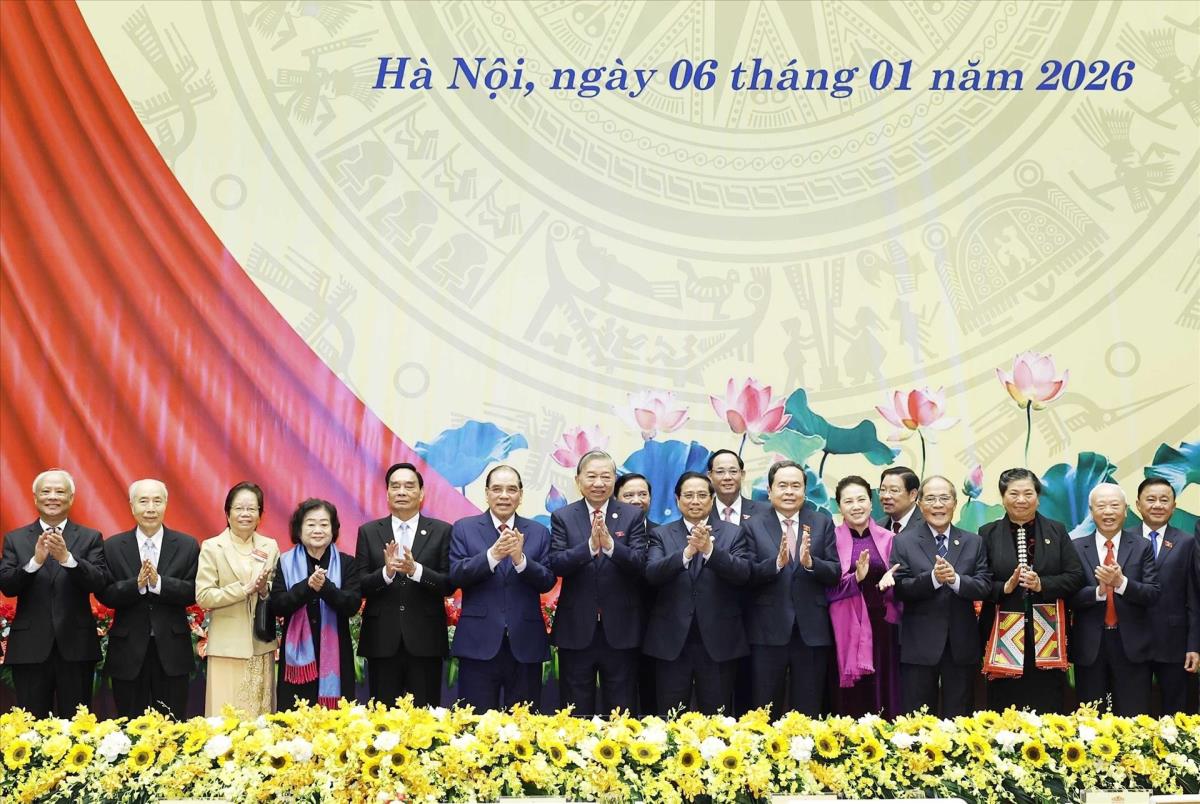 Tổng Bí thư Tô Lâm, các đồng chí lãnh đạo, nguyên lãnh đạo Đảng, Nhà nước dự Lễ kỷ niệm (6/1/2026). Ảnh: Thống Nhất – TTXVN