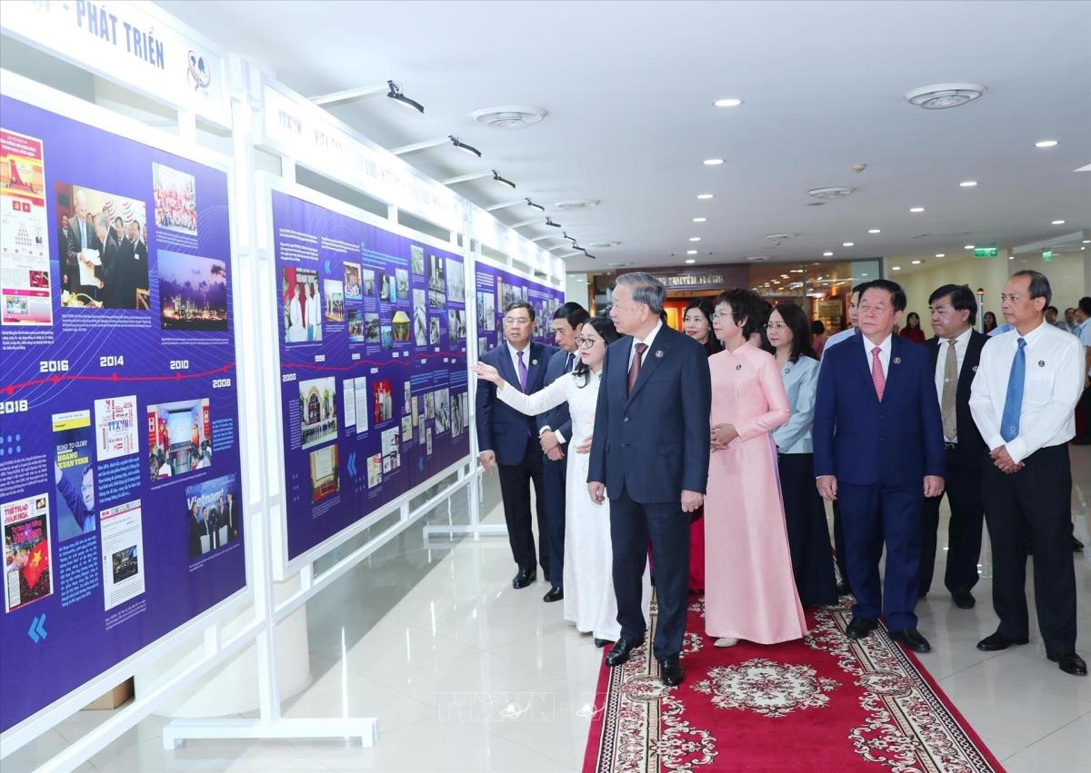 Tổng Bí thư Tô Lâm và các đại biểu tham quan trưng bày ảnh tư liệu chặng đường 80 năm TTXVN (14/9/2025). Ảnh: Trọng Đức - TTXVN