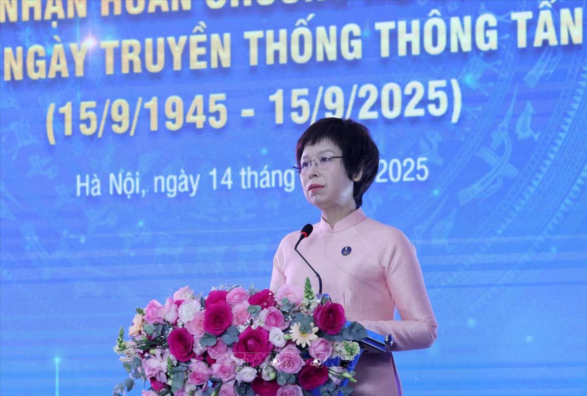 Đồng chí Vũ Việt Trang, Bí thư Đảng uỷ, Tổng Giám đốc TTXVN đọc diễn văn kỷ niệm 80 năm Ngày truyền thống Thông tấn xã Việt Nam (15/9/1945 - 15/9/2025) (14/9/2025). Ảnh: Lâm Khánh – TTXVN