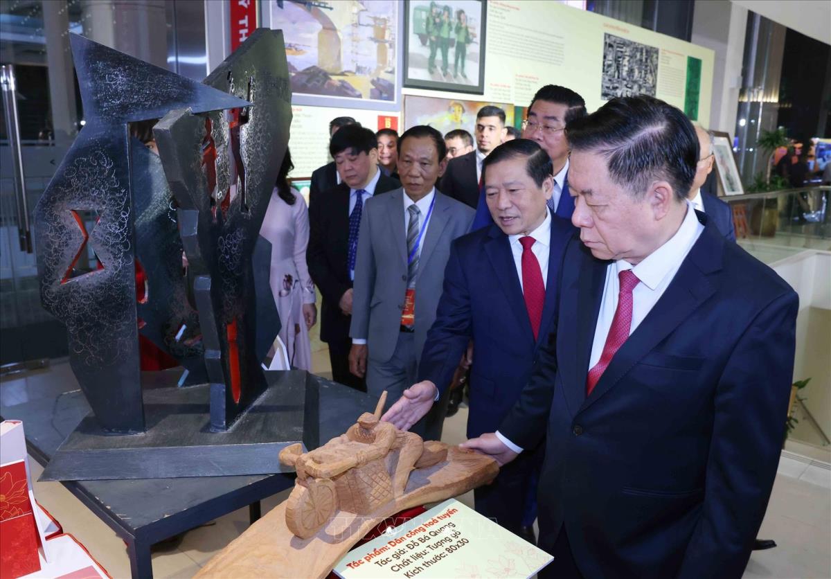 Trưởng Ban Tuyên giáo và Dân vận Trung ương Nguyễn Trọng nghĩa tham quan trưng bày các tác phẩm đoạt giải (19/5/2025). Ảnh: Phương Hoa - TTXVN