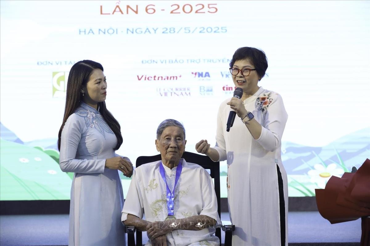 Tổng Giám đốc TTXVN Vũ Việt Trang và Phó Chủ tịch Hội Nhà văn Việt Nam, Chủ tịch Hội đồng giám khảo Trần Đăng Khoa trao giải "Hiệp sĩ Dế Mèn" cho nhạc sĩ Phạm Tuyên (28/5/2025). Ảnh: Lê Đông - TTXVN