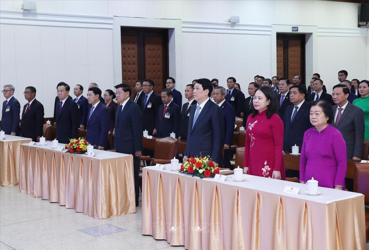 Chủ tịch nước Lương Cường và Tổng Bí thư, Chủ tịch nước Lào Thongloun Sisoulith cùng các đại biểu thực hiện nghi lễ chào cờ. Ảnh: Lâm Khánh - TTXVN