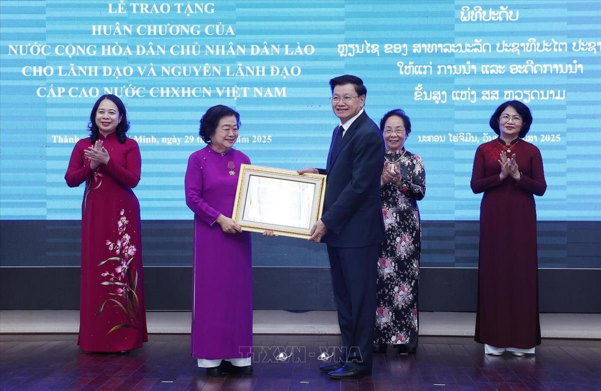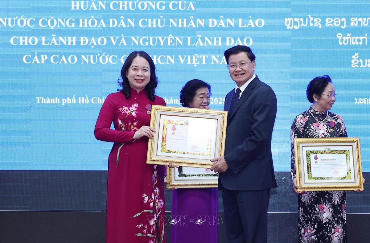 Tổng Bí thư, Chủ tịch nước Lào Thongloun Sisoulith trao Huân chương Tự do hạng Nhất của Nhà nước Lào tặng Phó Chủ tịch nước Võ Thị Ánh Xuân và các nguyên Phó Chủ tịch nước Trương Mỹ Hoa, Nguyễn Thị Doan và Đặng Thị Ngọc Thịnh (29/4/2025). Ảnh: Lâm Khánh - TTXVN