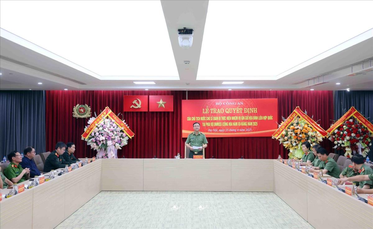 Hà Nội (TTXVN 25/4/2025) Sáng 25/4/2025, tại Hà Nội, Bộ Công an tổ chức Lễ trao quyết định của Chủ tịch nước cho sĩ quan đi thực hiện nhiệm vụ gìn giữ hòa bình Liên hợp quốc tại Phái bộ UNMISS (Cộng hòa Nam Sundan) năm 2025.