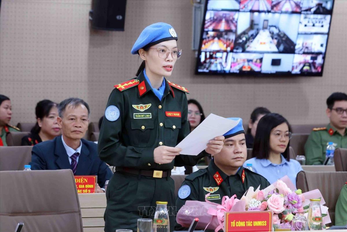 Đại úy Trần Mỹ Linh đại diện Tổ công tác thực hiện nhiệm vụ gìn giữ hòa bình Liên hợp quốc tại Phái bộ UNMISS (Cộng hòa Nam Sundan) phát biểu (25/4/2025). Ảnh: Phạm Kiên - TTXVN