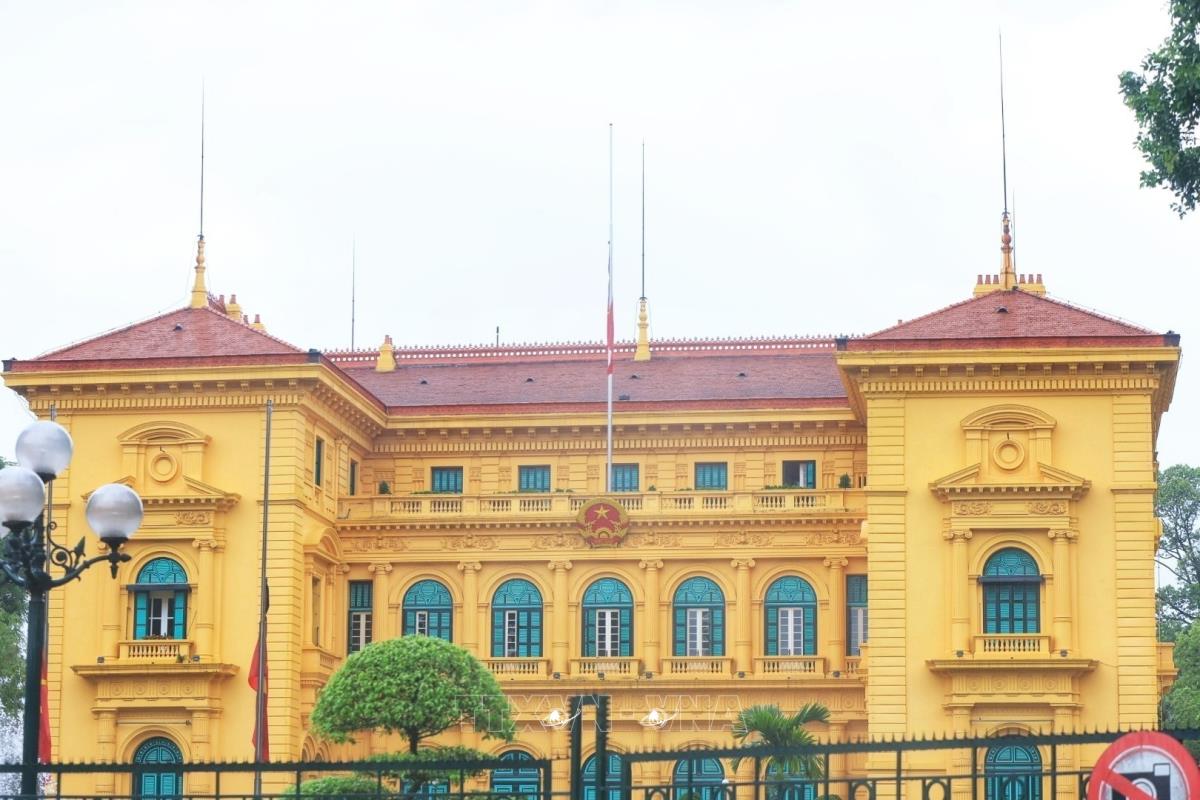 Nghi thức treo cờ rủ Lễ Quốc tang nguyên Chủ tịch nước Trần Đức Lương tại Phủ Chủ tịch (24/5/2025). Ảnh: Tuấn Anh - TTXVN