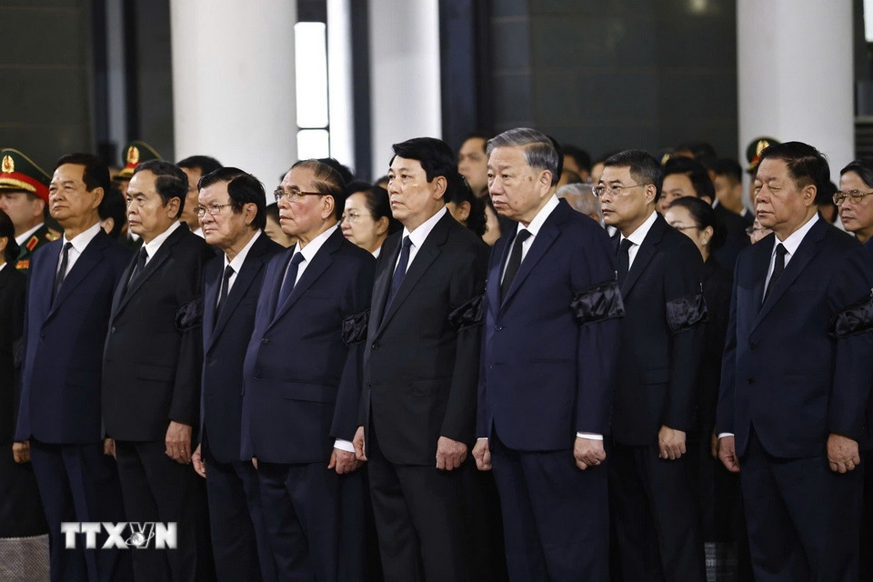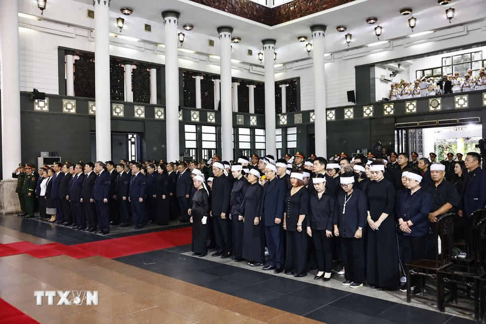 Tổng Bí thư Tô Lâm, các đồng chí Lãnh đạo, nguyên Lãnh đạo Đảng, Nhà nước và gia quyến nguyên Chủ tịch nước Trần Đức Lương tại Lễ truy điệu (25/5/2025). Ảnh: TTXVN