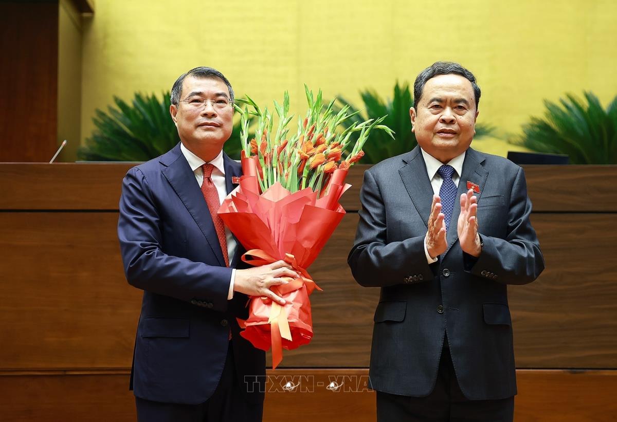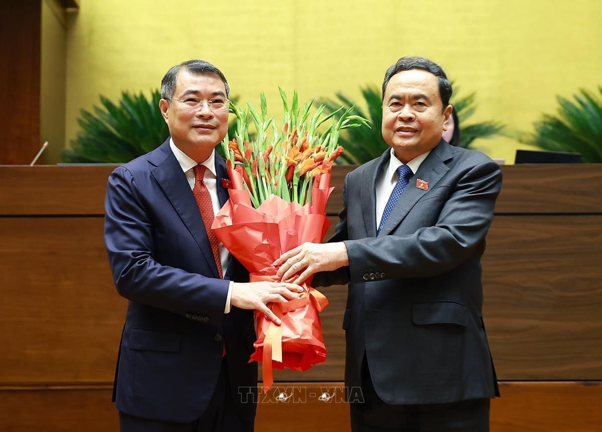 Chủ tịch Quốc hội Trần Thanh Mẫn thay mặt lãnh đạo Đảng, Nhà nước, Mặt trận Tổ quốc Việt Nam và Đại biểu Quốc hội khóa XVI tặng hoa chúc mừng Thủ tướng Chính phủ Lê Minh Hưng (7/4/2026). Ảnh: Dương Giang - TTXVN
