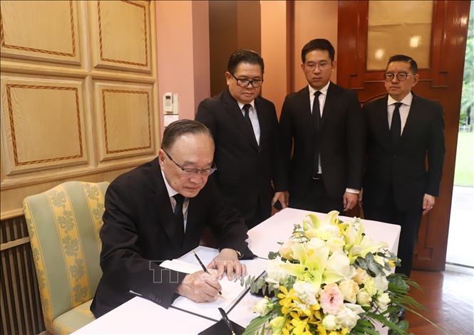 Đại diện Tập đoàn CP Thái Lan tới viếng và ghi sổ tang tưởng niệm nguyên Chủ tịch nước Trần Đức Lương, ngày 24/5/2025. Ảnh: Đỗ Sinh/PV TTXVN tại Thái Lan