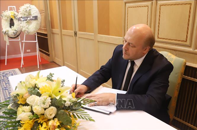 Đại sứ Phạm Việt Hùng ghi sổ tang, ngày 24/5/2025. Ảnh: Đỗ Sinh/PV TTXVN tại Thái Lan